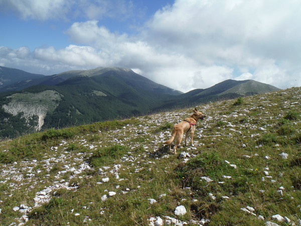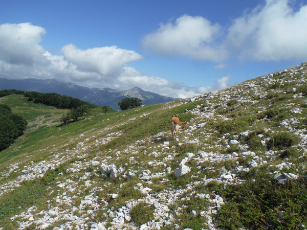 Il giorno dopo, ferragosto, lasciamo l’albergo per una gita a Campo Catino. Inizialmente ci fermiamo al bar-ristorante all’altro lato del piazzale rispetto all’albergo. Ci sono le sdraio, c’e’ un bel sole e noi ce lo godiamo tutto. Vorremmo fermarci da loro anche per il pranzo ma hanno difficolta’ ad ospitare i nostri cagnolini quindi rinunciamo. Betti va allora a chiedere al ristorante dell’albergo, pare non ci siano problemi. Ottimo. Nel frattempo il sole e’ stato sostituito dalle nuvole, non sembra piovera’ ma di sole ne vedremo ancora poco. Per ingannare l’attesa prima di pranzo decido di fare una passeggiata, devo cercare la grotta degli urli con le nuove indicazioni. Prendo con me Luna e Blu e andiamo. Come al solito arrivati al prato sciolgo Luna che parte come un missile, la direzione gia’ intuisce sia la stessa della volta scorsa. Un attimo e Luna e’ gia’ sulla cresta mentre Blu, la tengo al guinzaglio perche’ tempo possa darsi alla macchia o cadere in qualche buco, freme per raggiungerla. Richiamo Luna e proseguo sul lato sinistro mantenendomi in quota. Quando arrivo ad affacciarmi al paesaggio sottostante dovrei essere al punto giusto per gli Urli.