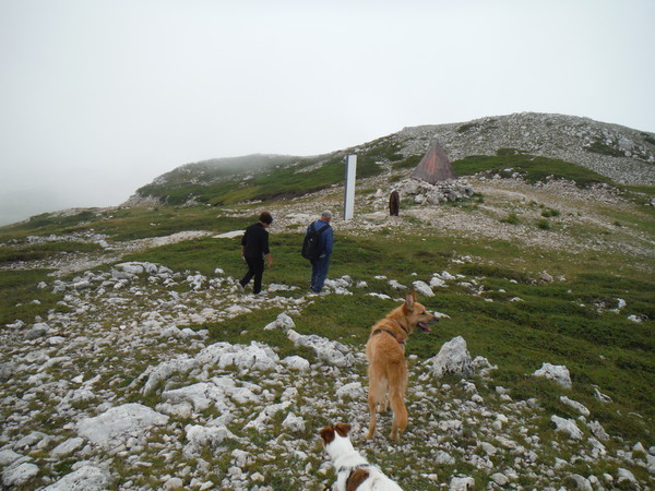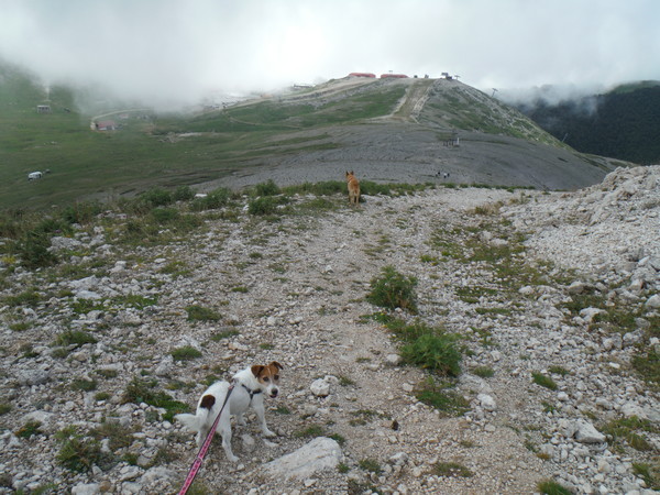 Alla nostra sinistra c’e’ il gruppo che avevo visto salire prima, stanno seguendo il sentiero che completa il percorso ad anello che parte dal parcheggio. Andrei pure io pero’ c’e’ un po’ di nebbia e ci sono delle pecore al pascolo nei pressi del sentiero. Non vorrei mai che Luna e Blu avessero un incontro poco amichevole con i cani pastore che sicuramente vigilano nei dintorni del gregge. Per questo motivo e anche perche’ e’ quasi ora di pranzo decido di prendere la “scorciatoia” andando dritti dritti in direzione del parcheggio. Scendiamo con altre persone verso quella che sembra l’inizio della pista in disuso.