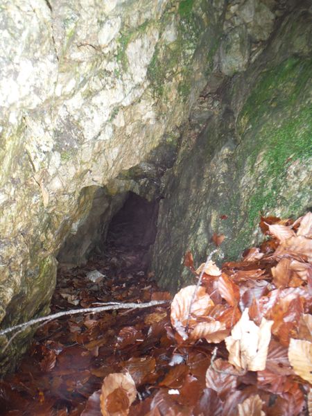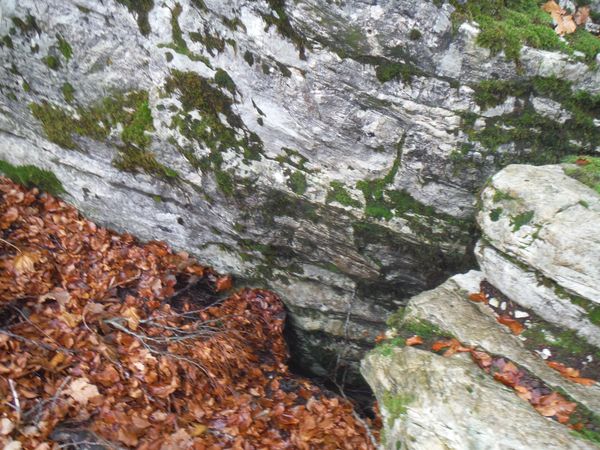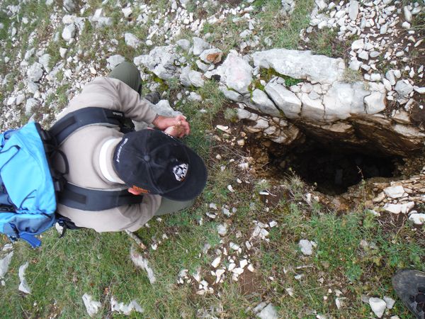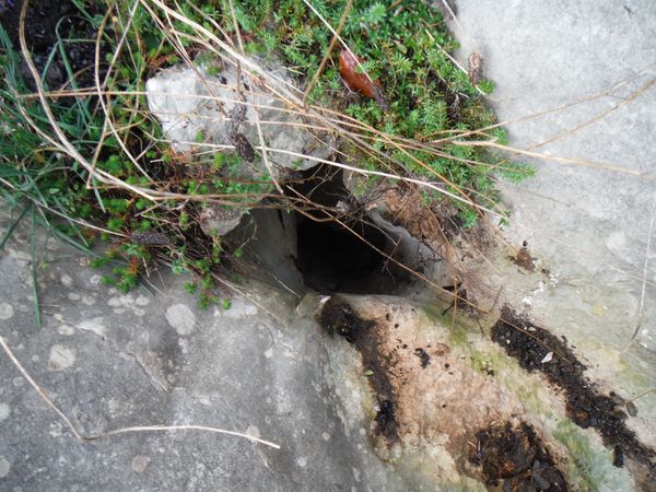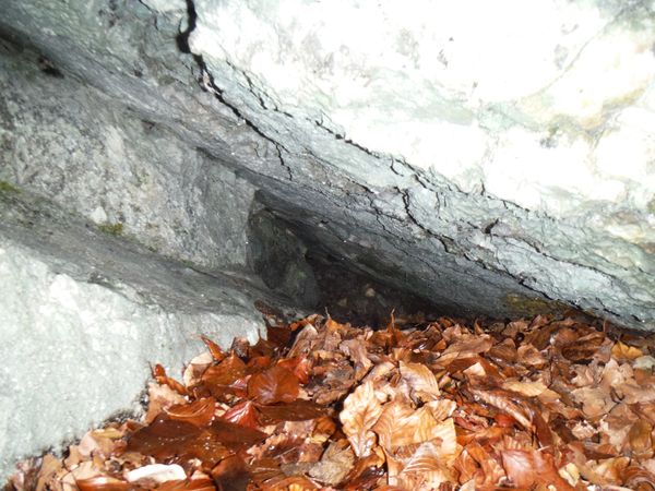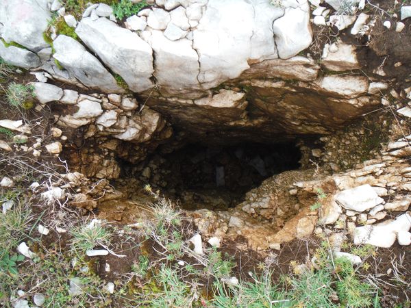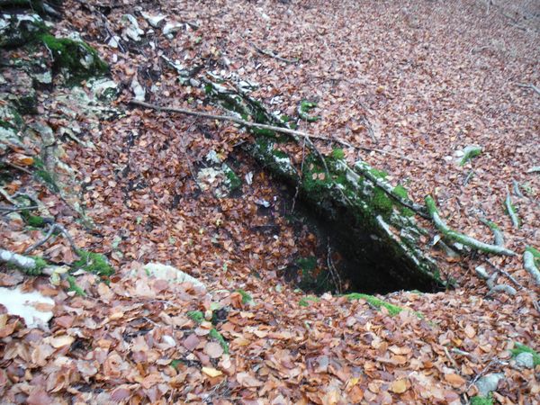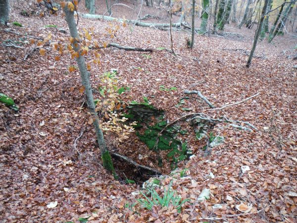 Iniziamo a percorrere la strada carrabile in discesa per raggiungere l’attacco del sentiero che ci riportera’ alla macchina. Strada facendo incontriamo alcuni buchi, intanto vi mostro il primo.