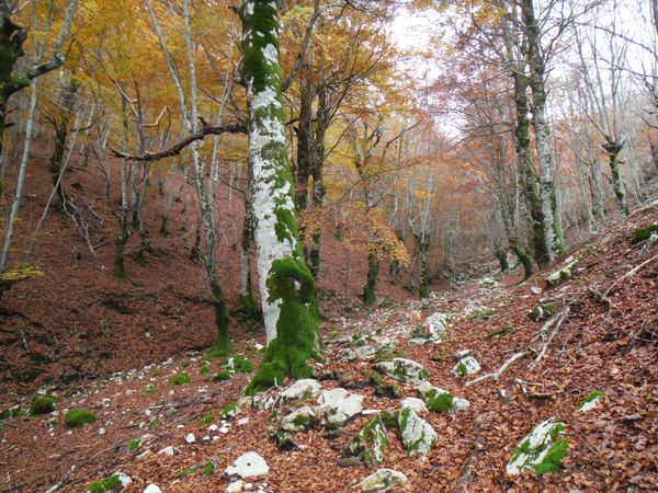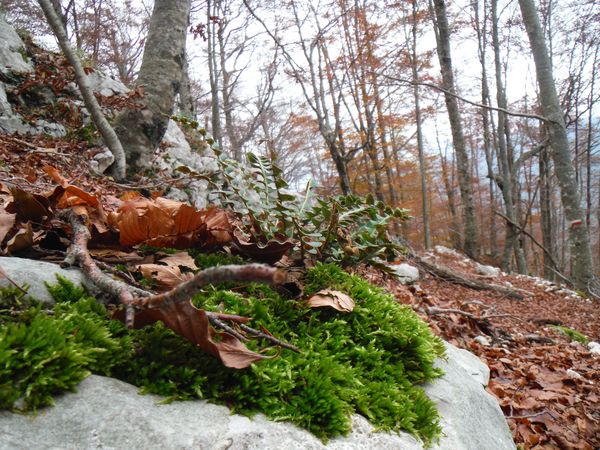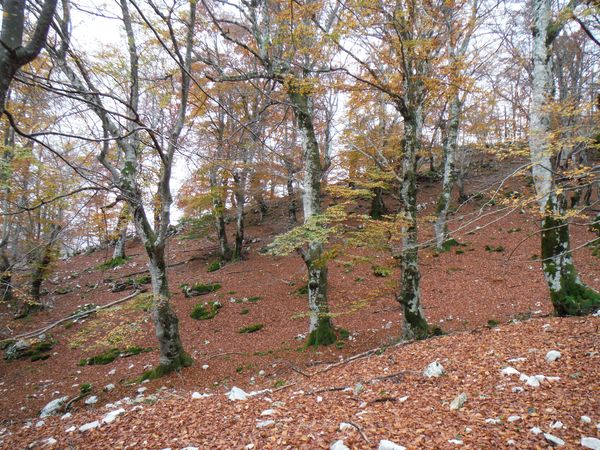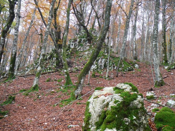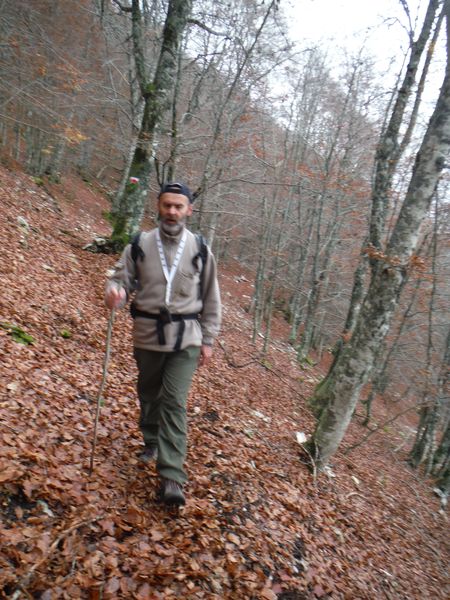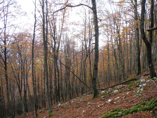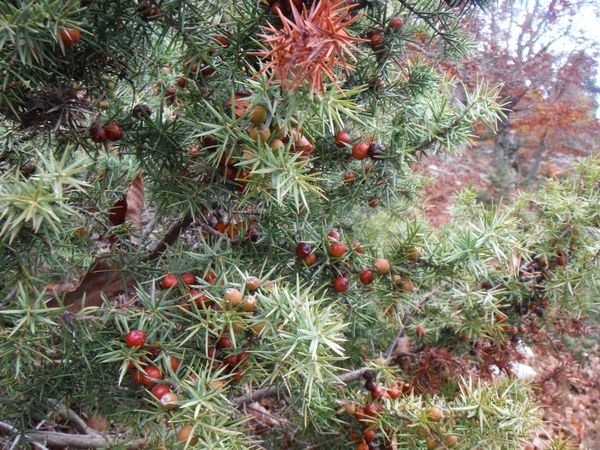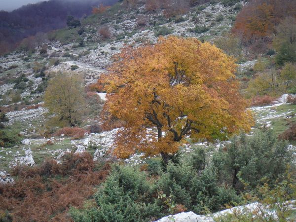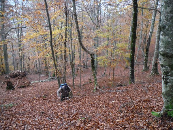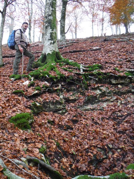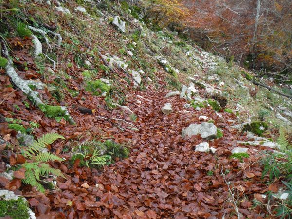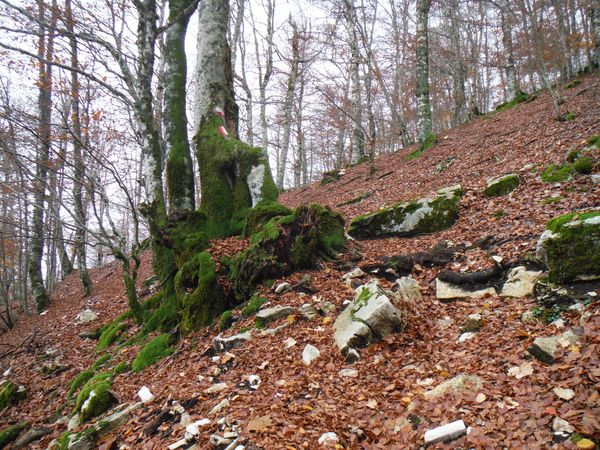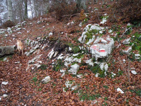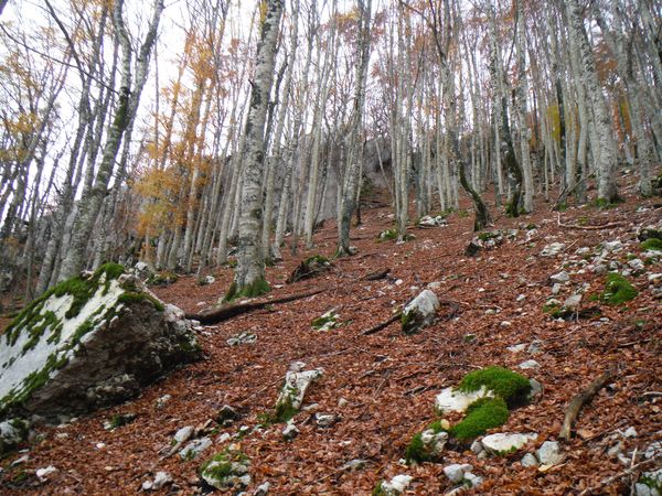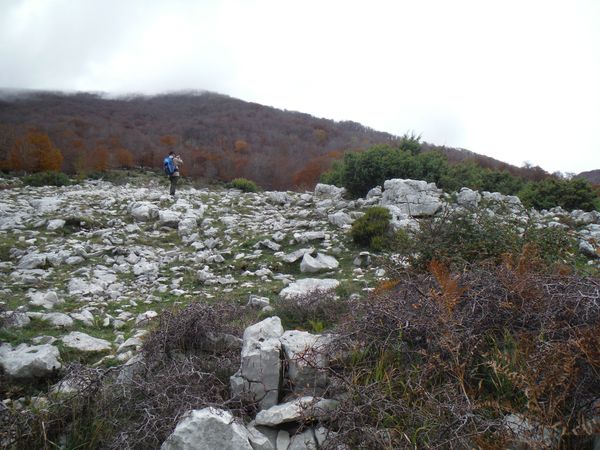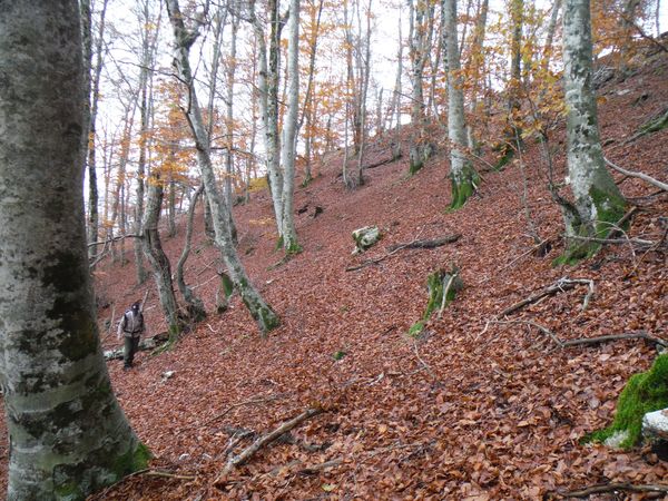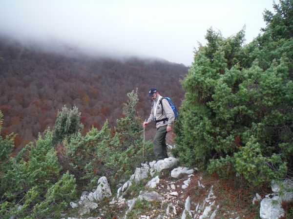 Saliamo lungo il sentiero, lo seguiamo fino a superare una “S” e dopo prendiamo a destra perpendicolari al sentiero seguendo un canalone appena accennato che scende giu’ dritto dalla cresta. Mi aiuto cercando alcuni segni di vernice fatti tempo fa da Vincenzone (vecchia gloria della sezione di Carpineto dello SCR). Saliamo a zigzag quasi in verticale cercando di evitare spiacevoli contatti con gli acuminati aghi dei cespugli di ginepro.