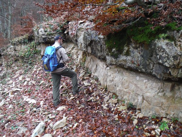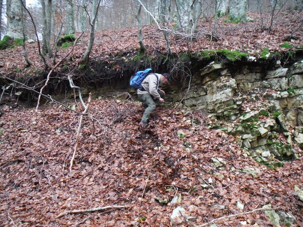Contrariamente a come ho sempre fatto io, Maurizio gira intorno al Cavone e poi prosegue la salita. Quasi inciampa in un buco. Ecco mentre lo ispeziona.
