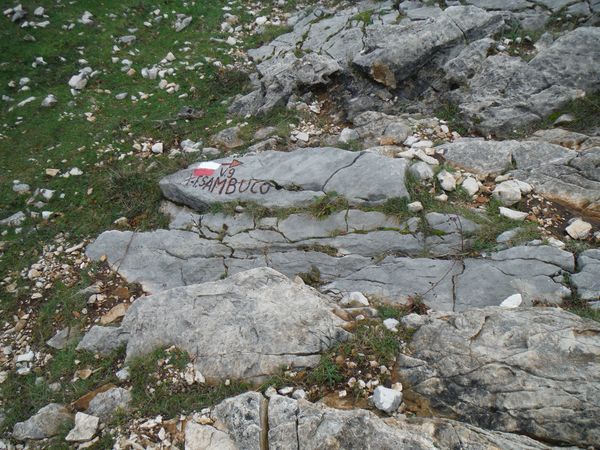 Scendiamo procedendo a zigozago. La pietraia non e’ meno antipatica del solito e rischio, come al solito, di rovinare a terra almeno un paio di volte. Intercettiamo un sentiero che va verso destra. Comunico a Maurizio che credo vada nella direzione che serve a noi e prendo a seguirlo.
