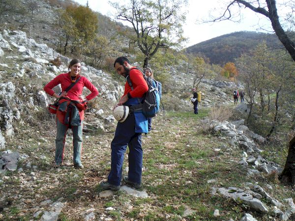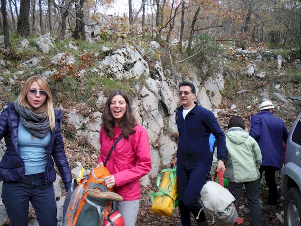 L’appuntamento e’ gia’ da solo di quelli memorabili, quasi eroici, alle 7 del mattino al bar “fico” ad Anagnina. Ho scroccato un passaggio in macchina a Maurizio, deve passare a prendermi alle 6.30. Come sempre mi sveglio con largo anticipo, sono appena le 5 quando apro gli occhi. Rimedio con una lunghissima doccia. Finisco di prepararmi senza fare rumore per non disturbare Betti che ancora dorme. Maurizio mi squilla al cellulare, e’ nei pressi di casa. Quasi quasi, da tanto presto che era, riesco a fare tardi. Esco, saluto Maurizio e guardo contrariato il cielo. Nonostante le fantastiche previsioni del tempo che davano la sera prima in televisione, stamane pioviggina. Mollo lo zaino a Maurizio e torno a casa a prendere un ombrello. Ora, muniti di parapioggia, possiamo partire con tranquillita’. Il raccordo e’ quasi sgombro a quest’ora antelucana, arriviamo al bar “fico” anche con qualche minuto di anticipo. Mi fiondo dentro al bar, ho una fame da lupi che placo con un ottimo cornetto ed un cappuccino. Con l’arrivo della luce del giorno arrivano alla spicciolata anche tutti gli altri partecipanti alla gita. Per favorire la socializzazione, e solo per questo alto fine, partecipo alle colazioni un po’ di tutti arrivando a collezionarne ben 3! Tra una cosa e l’altra abbiamo fatto quasi le 8, e’ proprio l’ora di partire. Fuori dal bar un momento di concitazione con persone e zaini che si muovono da macchina a macchina con lo scopo di prenderne il meno possibile. Alla fine pero’ i conti non tornano, manca un posto. Maurizio si sacrifica e riprende la sua auto, io vado con lui per fargli compagnia. Partiamo tutti tranne Max che aspetta Lucilla, in lieve ritardo. Ci diamo appuntamento all’uscita Pontecorvo-Castrocielo dell’autostrada Roma-Napoli. Quando siamo in loco prendiamo per Esperia e ci fermiamo lungo la strada al primo bar aperto. L’intenzione sarebbe quella di un altro caffe’ ed una sosta bagno. Telefono a Max per avvertirlo. Mi annuncia che e’ appena uscito dall’autostrada, e’ a pochi metri da noi. Ci raggiunge e ci incita a ripartire subito. La sosta sfuma. Arriviamo ad Esperia. Qui recuperiamo anche i 2 Stefani, gli ultimi membri della nostra allegra comitiva che sono partiti da solatie localita’ marine. Dopo aver parcheggiato le macchine e salutato gli ultimi arrivati andiamo in massa alla conquista del locale bar. Strada facendo mi fermo all’alimentari dove chiedo un piccolo pezzo di pizza. Sono cosi’ contenuto nella richiesta che addirittura me la regalano. Esco contento dal negozio sbocconcellando la pizza e raggiungo il gruppo al bar. Qui finalmente riesco anche a fare la pausa bagno, ci voleva proprio. Ora possiamo ripartire. Ci raggruppiamo, torniamo alle macchine e via. Dobbiamo salire alla parte alta di Esperia e poi attraversarla passando per stradine veramente anguste. Ad un certo punto c’e’ pure un tratto a senso unico alternato regolato da un semaforo. Aspettiamo pazientemente e poi proseguiamo fino all’uscita del paese. Dopo, la strada non diventa molto piu’ larga pero’ per fortuna non incontriamo macchine in senso opposto al nostro. Ce ne sono solo alcune parcheggiate a bordo strada, i proprietari, cacciatori a vedere come sono bardati, ci osservano incuriositi. Lungo la strada incontriamo molti blocchi rocciosi con interessanti buchi. Ne prendo al volo una foto per mostrarvela.