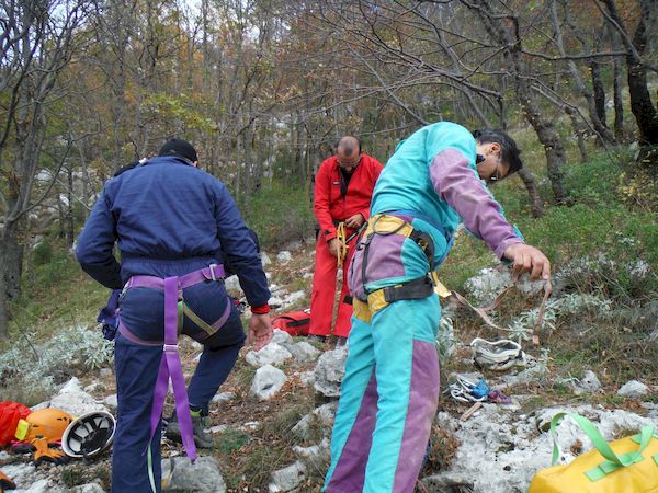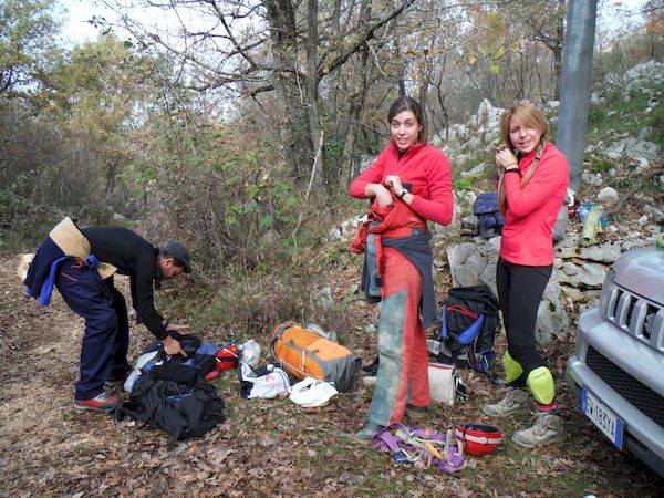 Siamo quasi pronti, facciamo la verifica delle corde e dei materiali. Mi prendo gli attacchi, la corda da 30 ed entro per attrezzare il primo pozzo.