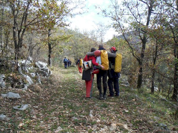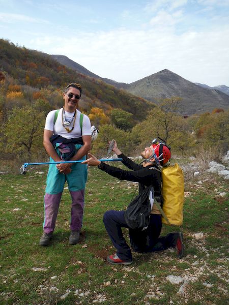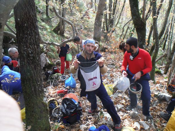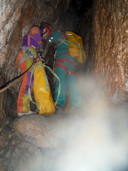 Il responso e’ positivo. Il sifone e’ praticamente asciutto, la striscia di fango compatto sul davanti della tuta di Stefano lo testimonia. Rapido conciliabolo tra i “maestri”; di materiale e corde ne abbiamo abbastanza. La progettata visita alla sala Federico Donati e’ rimandata alla prossima volta. Faremo la traversata. Questo cambio di programma ci costringe a rivedere la logistica. Avevamo portato con noi il necessario per cambiarci fuori dalla grotta alla fine del giro. Ma questo presupponeva l’entrata e l’uscita dall’ingresso alto. Lasciare i vestiti asciutti all’ingresso basso e’ impensabile, rischiamo di trovare tutto infangato o al peggio fradicio. Con pazienza quindi smontiamo tutto il bagaglio.