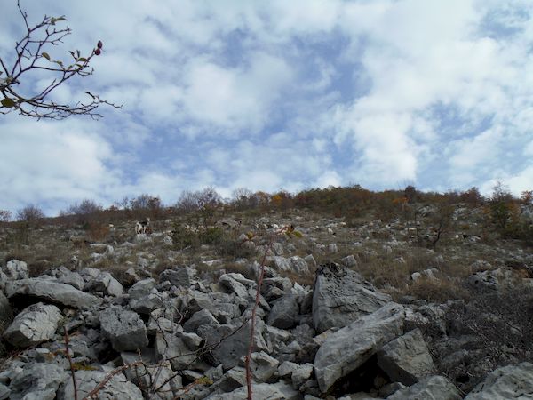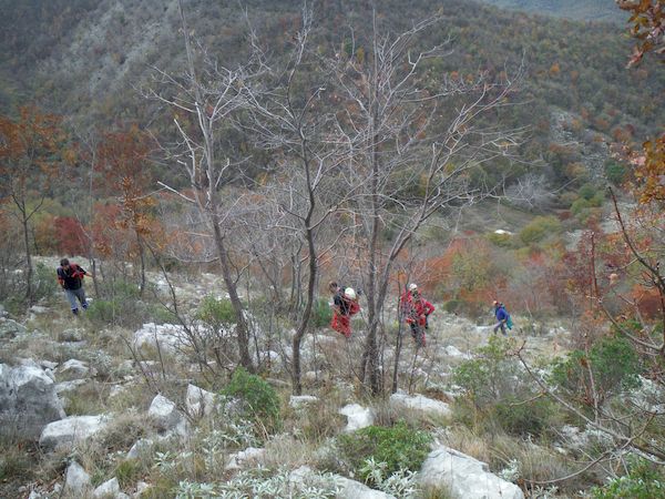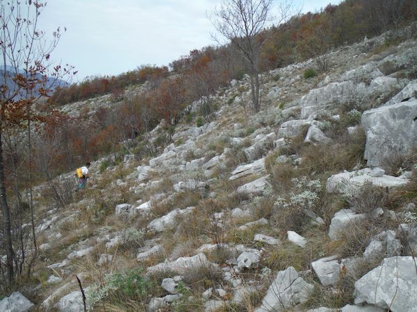 Il gruppo procede ognuno col proprio passo, ci sparpagliamo parecchio anche perche’ nessuno sa con precisione dove sia il fantomatico ingresso alto. La nostra unica risorsa e’ il GPS del mitico Fabio. Mentre procedo faticosamente sulla pietraia ogni tanto lo interrogo sulla direzione da tenere. Le indicazioni dicono di procedere verso l’alto ed a sinistra.