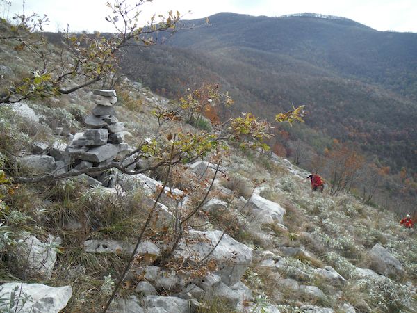 Avanzo cercando una qualche traccia dell’ingresso. All’improvviso ecco un segno convincente. In alto a sinistra c’e’ un ometto di pietre. Cosa puo’ essere se non una indicazione dell’ingresso? Mi dirigo verso di lui senza esitazioni. Nella foto e’ in alto a destra, con un po’ di fantasia e pazienza lo trovate anche voi!
