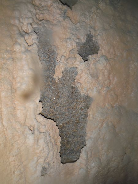 Attrezzo il primo pozzo in modo che poi l’ultimo possa scendere in doppia. Sono necessari pero’ ben 3 deviatori e quando arrivo alla base la corda basta appena. Mentre scendo arriva Max e subito entra pure lui. Scendendo sistema la corda, chi scende per ultimo dovra’ farlo in 2 fasi, arrivare a meta’ pozzo, sfilare la corda dall’attacco in alto, riarmare in doppia sull’ultimo attacco e scendere alla base del pozzo. Con Max esaminiamo assieme il pozzo successivo. E’ abbastanza articolato sia da passare che da disarmare. Per assicurarci che chi scendera’ per ultimo il primo pozzo faccia esattamente come serve e per fare il disarmo del pozzo successivo, decidiamo di dividerci. Max andra’ avanti ad armare, credo sia l’unico che conosce la traversata, io rimarro’ per ultimo a fare il disarmo il piu’ velocemente possibile per ripassargli avanti il materiale. Mentre aspetto gli altri mi diletto a fare una foto alla parete della saletta dove sosto. La parete e’ composta sostanzialmente di sabbia, arenaria, mi dice l’ineffabile Ersimio, ed e’ ricoperta da un sottile strato di concrezione. Non ricordo di aver mai visto una simile configurazione.