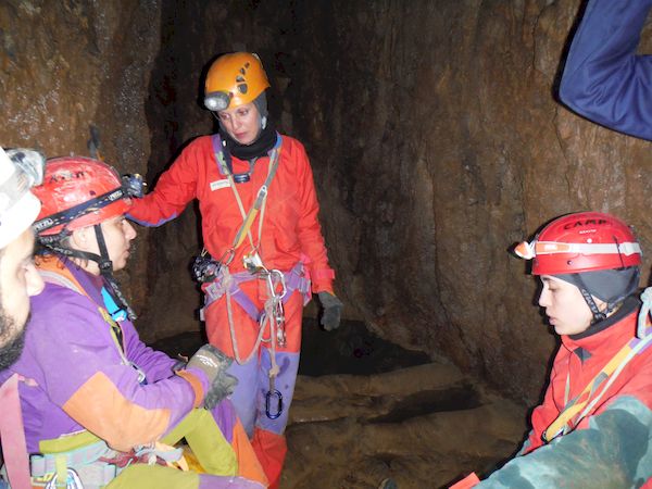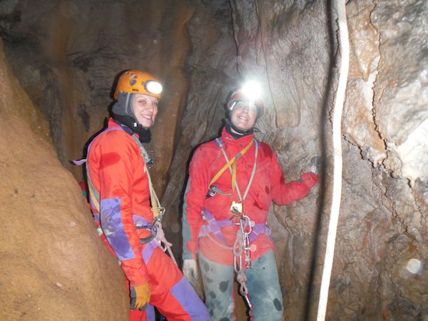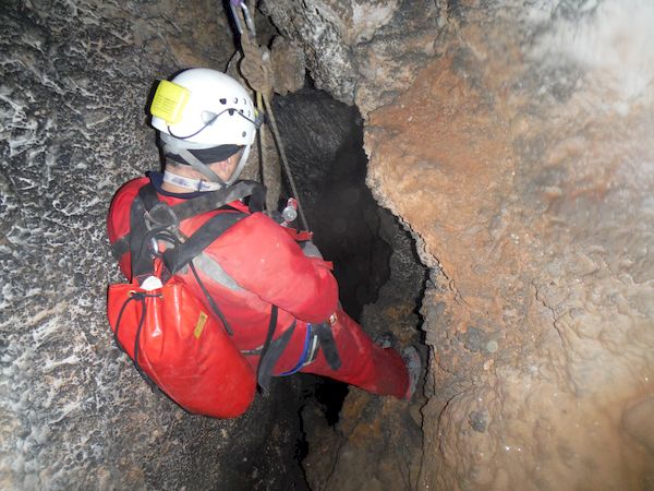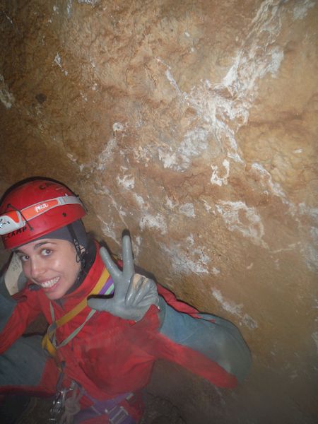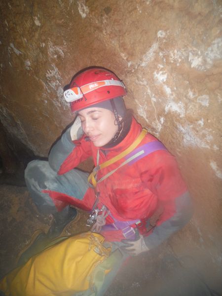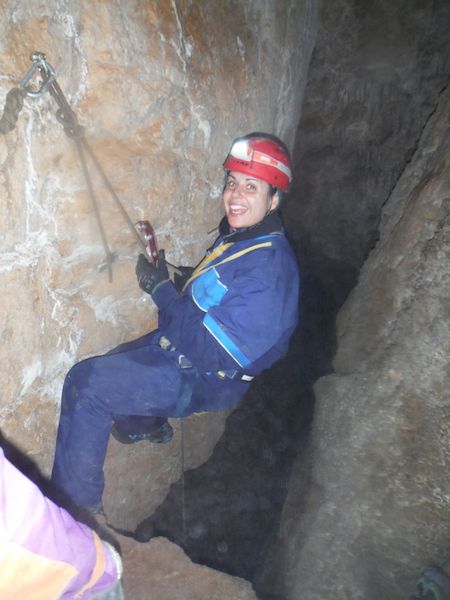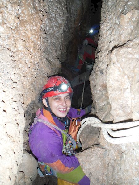 Il fondo del pozzo e’ un po’ stretto. Alessandra, partita con impeto, non riesce a passare. Dopo diversi tentativi decidiamo sia il caso di farla risalire ed armare una via piu’ in alto che con un traverso aereo passi oltre il pezzo stretto. Ecco Alessandra, provata ma combattiva, che risale.