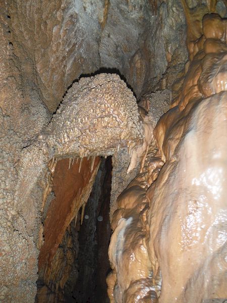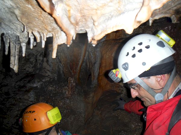 Alla base del pozzo raggiungiamo il fondo del meandro, nel verso opposto alla nostra direzione ecco un esempio dell’intenso e bellissimo concrezionamento che sbarra la strada.