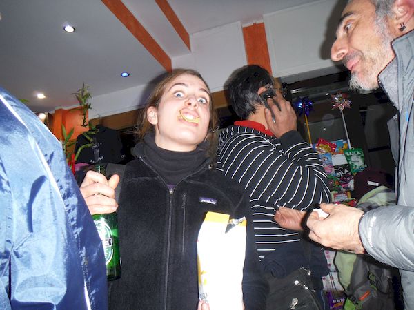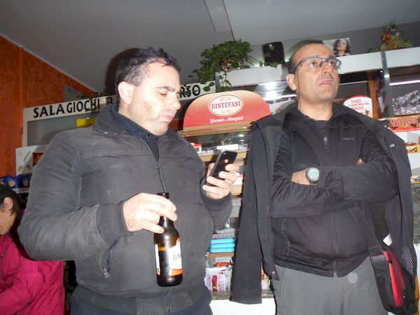 Questo era l’ultimo ostacolo verticale da passare su corda. Max ed io rimaniamo a disarmarlo mentre il resto del gruppo si muove verso l’uscita. Arriviamo che alcuni di loro sono fermi sui bordi di un laghetto e si apprestano ad attraversarlo. Ci aggiorniamo sulla situazione. Un gruppetto, capitanato da Stefano drinkwater si e’ immerso nelle gelide acque ed e’ passato oltre. Gli altri , piu’ prudentemente hanno atteso il nostro arrivo fino a qualche minuto prima poi, non vedendoci, hanno iniziato a bagnarsi per tentare l’attraversamento in umido. Si sono subito ritratti dall’acqua sentendoci arrivare. Hanno fatto benone, perche’ Max si ricorda di un passaggio alto e, cerca cerca, lo trova. Io lo seguo come un ombra ed evito cosi’ di bagnarmi come i miei compagni di avventura. Oramai si sente l’aria dell’esterno. Dopo essermi accertato che tutti abbiano passato indenni la stretta risalita che dal laghetto porta al cunicolo di uscita mi avventuro a percorrerlo. Sbuco un una sala larga e bassa, pavimentata a fango. Deve essere l’anticamera del sifone. Trovo ancora un mucchio di persone. Stanno raccogliendo il coraggio per la strisciata finale nella pozza fangosa e freddissima che preclude all’uscita dalla grotta. Ci sono Vincenzina ed Alberto che stanno affrontando la dura prova, dai lamenti che si sentono si intuisce quanto sia fredda l’acqua. Non sto a pensarci su, mi tuffo dietro ai piedi di Alberto facendogli fretta perche’ passi. Il contatto con l’acqua e’ tutt’altro che piacevole pero’ passo camminando sui gomiti e sulle ginocchia ed incredibilmente mi bagno pochissimo. Addirittura riesco a mantenermi i piedi asciutti. Esco fuori. Trovo Max vicino all’uscita che fa accoglienza ai nostri impavidi quanto provati corsari. Ad un metro da noi c’e’ un gruppetto che si riscalda nientepopodimenoche davanti ad un bel fuoco scoppiettante. In prima fila c’e’ l’ottimo Stefano drinkwater il quale mi racconta della traversata nel laghetto con passaggio basso e bagnata fino al collo. Nell’impresa e’ stato seguito da pochi valorosi. Sono tutti usciti presto, ma bagnati zuppi e quindi dopo un’ora di attesa nella fredda nottata stavano morendo dal freddo. Da qui la necessita’ del fuoco ristoratore. Mentre noi siamo affaccendati in chiacchiere pian pianino escono tutti. Ci raduniamo ed iniziamo a scendere in fila indiana. Di trovare il sentiero nemmeno l’idea pero’ scendiamo spostandoci leggermente ma costantemente verso destra. Quando il terreno diventa quasi piano tiriamo giu’ dritti. Arriviamo alla famosa cisterna citata tra le note per arrivare alla grotta. Li’ praticamente parte, o se preferite finisce, la strada. Basta seguirla per arrivare alle macchine ed ai vestiti asciutti. Ci cambiamo. Personalmente senza particolare fretta, la temperatura non e’ proprio rigida. Quando sono presentabile recupero i panini avanzati e me li gusto offrendoli un po’ a tutti. Sono le 11 di sera, passate anche. Purtroppo anche questa volta la cena al ristorante e’ andata. Quando siamo tutti pronti rifacciamo la spola con i fuoristrada fino alle altre macchine e poi partiamo alla volta del bar di Esperia, sperando che almeno lui ci aspetti aperto. La strada non e’ piu’ larga dell’andata ma almeno vista l’ora non incontriamo anima viva e sbarchiamo velocemente al bar. Vi faccio una rapida panoramica della nostra invasione pacifica. Ecco un tavolino corsaro con bevande e relax.