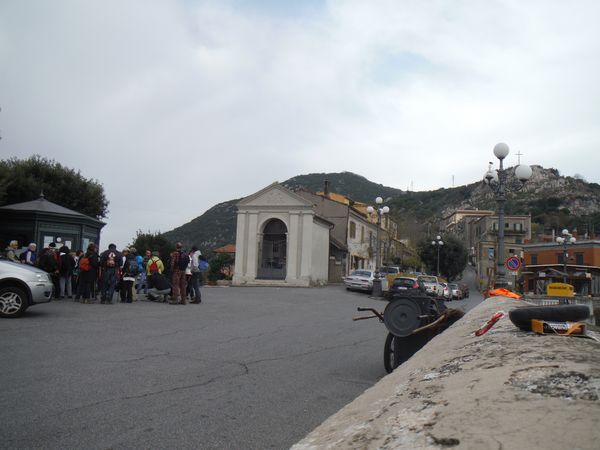 L’appuntamento e’ direttamente alla grotta pero’ sono in anticipo e arrivo fino a S.Oreste per fare alcune commissioni. Tra le altre c’e’ quella di prendere le coordinate della piazzetta con il GPS. Naturalmente quando tento di accenderlo lui si rifiuta perche’ dice di avere le batterie scariche. Rimedio subito andando a comperarne di nuove. Ecco allora subito subito una immagine che riprende il GPS al lavoro ed un gruppo di persone che si avviano a fare una gita per il Soratte.