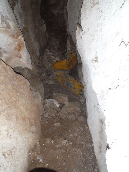 Parte finale della spaccatura, vi abbandoniamo gli zaini, non serviranno piu’ giu’ e sarebbero di impaccio.