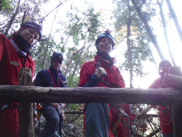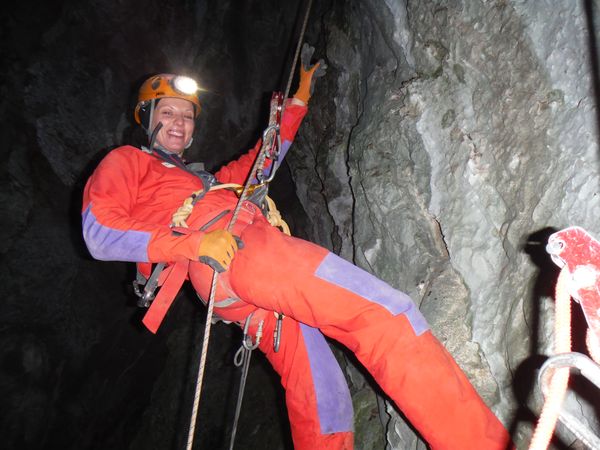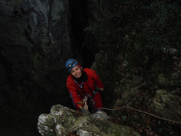 Dopo un rapido esame pero’ dalla destra mi sposto di nuovo a sinistra, vicino all’altra corda. A destra ci sono troppi sassi smossi pronti a cadere, meglio lasciarli indisturbati. Metto un paio di fix, sposto la prima corda e sistemo la seconda. Nel frattempo Marco ha terminato l’armo delle 2 calate. Lo raggiungo per ammirare tutto l’insieme poi me ne risalgo avvertendo Matilde che e’ il suo turno di scendere. Quando mi fermo mi accorgo di sentire freddo, mi fanno notare che sono riuscito a sudare tanto da infradiciare la tuta. Non me ne curo, stiamo iniziando a scendere e tra poco mi scaldero’ di nuovo. Nella prossima foto ecco una sorridentissima Matilde che si appresta a raggiungere Marco per la prima discesa. Per molti di coloro che scenderanno oggi e’ la prima volta che si cimentano con una calata cosi’ lunga nel vuoto, ho raccontato loro che anche per me lo e’ stata, oramai qualche anno fa. Lo dico sperando che anche per loro sia una bella ed emozionante esperienza da ricordare con piacere negli anni futuri.