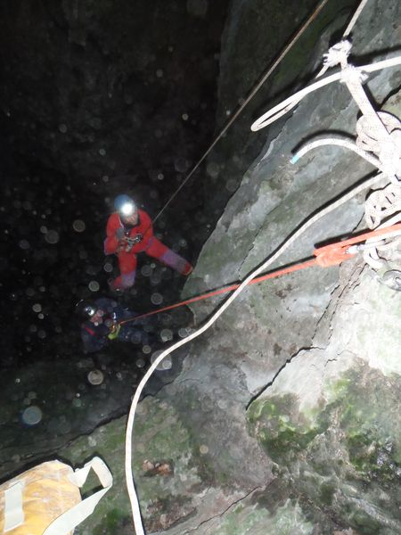 Mi interrompo qualche minuto, passano Mariangela e Paolo per una rapida visita ai Meri. Quando si allontanano riprendo a trafficare con il mio caos di roba. Sistemo la corda e scendo, voglio verificare lo stato degli attacchi e se c’e’ la possibilita’ di fare 2 calate non eccessivamente vicine tra loro. Sistemo la prima corda frazionando sui fix messi la volta scorsa. Scendo, sul lato sinistro, guardando spalle al Mero, ed arrivo alla zona dove parte il pozzo in libera. In effetti ci sono 2 gruppi di attacchi, 3 attacchi a spit sulla sinistra e 3 attacchi, 2 a fix ed 1 a spit sulla destra. Ottimo. Ho un po’ di attacchi personali con me, predispongo la partenza alla sinistra e poi prendo la via del ritorno. Mentre risalgo inizio a sentire del vocio, sono i miei amici che arrivano. Invoco un po’ di aiuto. Si offre Marco, eccolo che scende per terminare l’armo della prima partenza.