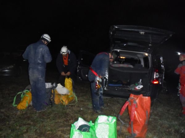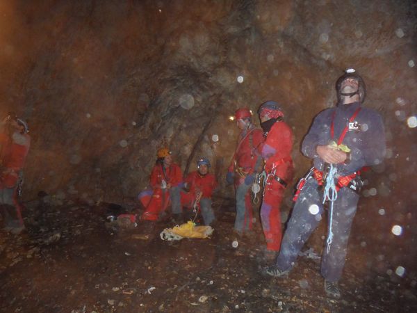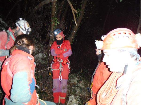 Con gli amici sono arrivati anche i materiali e le altre corde. In una fugace apparizione vedo Stefano che e’ disperato, aveva preparato tutti i sacchi con criterio ma noi gli abbiamo confuso tutto ed ora non si ritrova. Passa anche Giulio che distribuisce salsicce a pioggia, sono veramente deliziose. Vedo Simone, mi lascia la sua corda da 100 per la seconda calata. Rimaniamo d’accordo che lui con Giuseppe si occuperanno di armare la via che partendo dal dal Mero piccolo arriva al Mero grande passando per il finestrone. Sento che armeranno anche la grotta della Madonnina ma non mi posso interessare molto, c’e’ tanto da fare e tanti sono in attesa al freddo. Decisamente ora non ho tempo, rimando la visita alla Madonnina alla prossima volta. Ecco una foto dei pazienti “attenditori”.