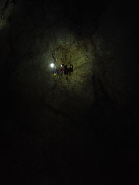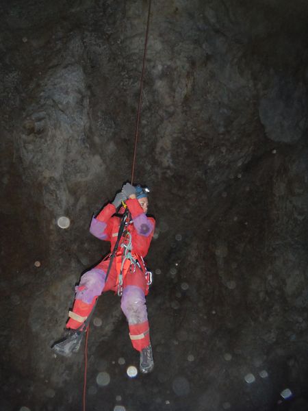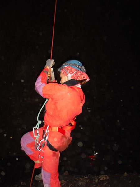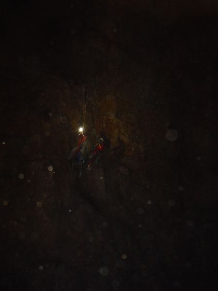Dal lato del Mero piccolo sono scesi Simone e Giuseppe e Matteo ma sembra non abbiano avuto altri seguaci. Gli altri sono andati tutti a visitare la Madonnina. Oltre a scattare qualche foto e fare uno spuntino, dopo la discesa c’e’ ben poco da fare, proponiamo di scendere giu’ a vedere la sala finale ma non dobbiamo essere proprio proprio convincenti perche’ nessuno aderisce alla proposta. Sara’ forse la fangosa discesa ripida e scivolosissima che promette molta fatica per risalire? Ho il vago sospetto sia stato proprio questo particolare a far desistere tutti! Terminati spuntini, foto e chiacchiere, inizia il freddo. I primi che sono scesi sono fermi da molto piu’ di un’ora. E’ arrivato il momento di risalire. Partono per primi Matilde e Marco. Matilde si cimenta con l’elasticita’ della corda che la lascia a terra anche se ne ha gia’ risaliti una decina di metri. Devo dire pero’ che se la cava egregiamente. Mentre noi ci ritiriamo in una vicina nicchia per evitare i sassi che possono cadere, loro salgono con buona regolarita’. Riesco a riprenderli mentre sono quasi 2 puntini. E pensare che sono ad un terzo della salita.