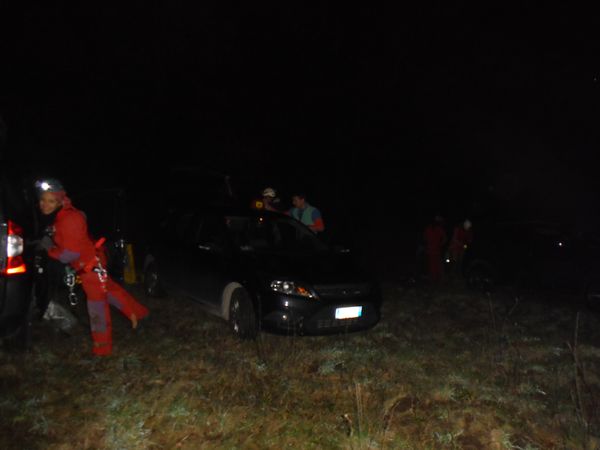 Dall’altro lato partono anche Vincenzina e Matteo, al solo vederli gia’ mi fanno male gambe e braccia. Con un po’ di invidia sento che Vincenzina e Matteo hanno anche l’energia ed il fiato per chiacchierare amabilmente tra loro durante la risalita. A breve parte anche Simone che inizia la risalita con disarmo del Mero piccolo. Da non so dove arriva una “breccola” che mi sfiora, prudentemente Giuseppe ed io ci ritiriamo nella nicchia a chiacchierare di feste e passate e future attivita’. Arriva finalmente la libera, iniziavo a sentire freddino anche io. Arrivo alla corda ed attacco gli attrezzi, guardo l’orologio, sono le 16.57. Inizio a salire. e’ dura, come immaginavo e’ proprio dura, cerco di assecondare il dondolio uniformando ad esso la mia pedalata, e’ d’aiuto ma non reggo il ritmo. Giuseppe e’ poco sotto di me, la sua luce si e’ spenta sul piu’ bello, ha terminato la carica della batteria. Non dovrebbe aver bisogno di molta altra luce tra quella che viene da fuori e quella che ho io. Sento vociare sopra di me, sono Simone e Giulio che stanno disarmando insieme. E’ un piacere quando finalmente li vedo, vuol dire che sono ben oltre la meta’ della risalita. Fiato permettendo scambio qualche battuta con loro e poi proseguo. Si sente che sono vicino anche perche’ e’ cambiata l’elongazione della corda, ora dondolo molto meno. La luce da fuori non arriva piu’, e’ scesa la notte, pero’ sono in vista del frazionamento. Cerco di mantenere una pedalata dignitosa per gli ultimi metri e poi con soddisfazione metto la longe con uno sbuffo soddisfatto. Passo il nodo con gli attrezzi ed inizio a smontare la partenza del pozzo con la sua corda da 100. Faccio un nodo al capo della corda e me la lego addosso prima di fare altro, fosse mai mi cadesse giu’ la corda, chi ce la farebbe mai a tornare giu’ a prenderla?!? Smonto la corda dagli attacchi e, anche se con fatica per il peso della corda, disfo il nodo. Caspita quanto pesa la corda ora che e’ appesa sotto al mio imbrago. Avverto Giuseppe che lascio a lui l’onere di togliere gli attacchi poiche’ non ho con me la chiave. Sono appena partito quando mi ricordo di guardare l’orologio, sono le 17.14. Sono partito 17 minuti fa, sono indulgente con me stesso quindi tolgo 2 minuti per il tempo passato a disfare l’armo e mi attribuisco il tempo di 15 minuti per la risalita. Pensavo molto peggio. Al frazionamento successivo vedo Giuseppe immerso nel buio, mi conferma che gli farebbe comodo un po’ piu’ di luce mentre disarma. Con la corda da 100 gli passo la mia luce di riserva. Quando finisce di sistemarsela sulla testa gli indico gli attacchi da togliere e poi proseguo. Al mio arrivo trovo una folla, sono usciti praticamente tutti, anche il gruppetto che e’ andato alla Madonnina. L’aria e’ decisamente fredda. Chi attende da parecchio inizia ad accusare.