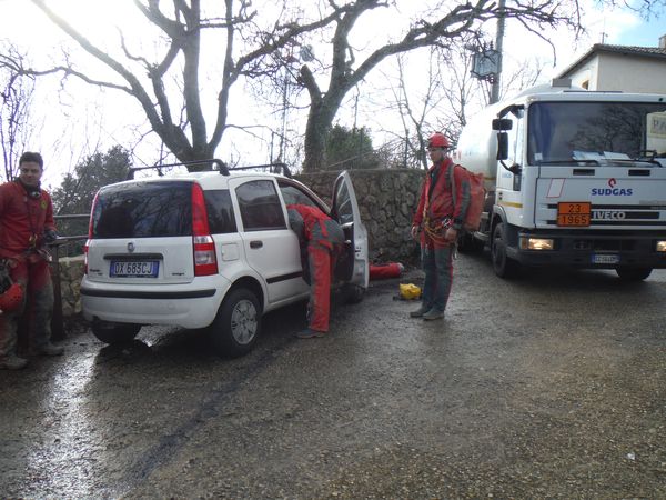 Ci incontriamo alla piazzetta di S.Oreste. Simone e’ arrivato in orario all’appuntamento, alle 9. Ha aspettano noialtri ritardatari fino alle 9.30. Per conto mio sono partito un po’ tardi da Roma poi ho dovuto fare una sosta per fare benzina e controllare alcuni strani rumori provenienti dal vano motore della macchina. Matilde e Marco abitando ad un passo da S.Oreste se la sono presa comoda e quindi siamo arrivati praticamente assieme. Per fortuna Simone non se la prende per il ritardo e ci incontra con un bel sorriso. Quando siamo finalmente tutti assieme facciamo una rapida puntata in pizzeria, parcheggiamo la mia macchina, trasferiamo il bagaglio su quella di Simone e partiamo. Al solito spiazzo in cima al Soratte ci prepariamo, oggi la temperatura e’ decisamente piu’ alta rispetto alla volta scorsa. Un ospite inatteso, il camion del gas che viene a rifornire l’eremo.
