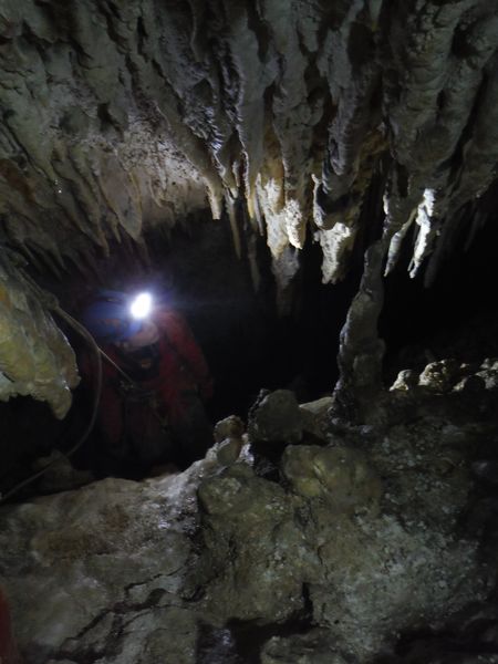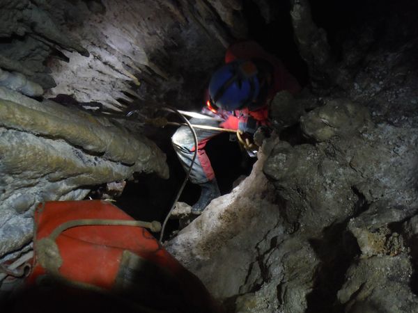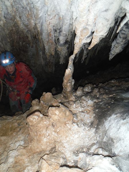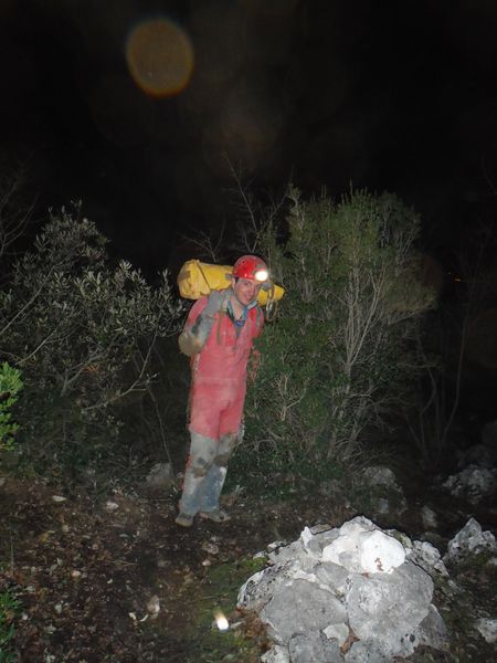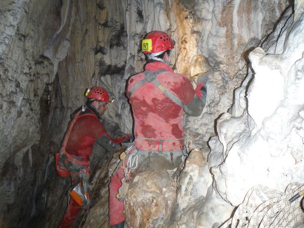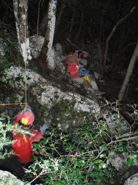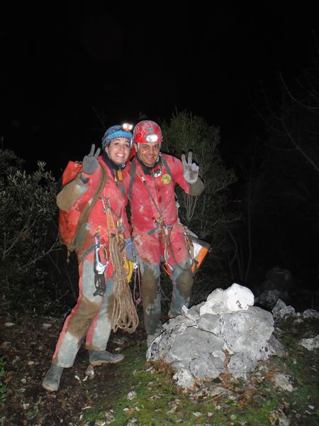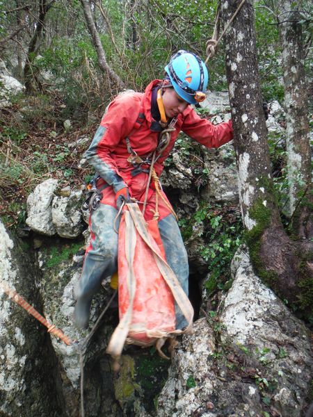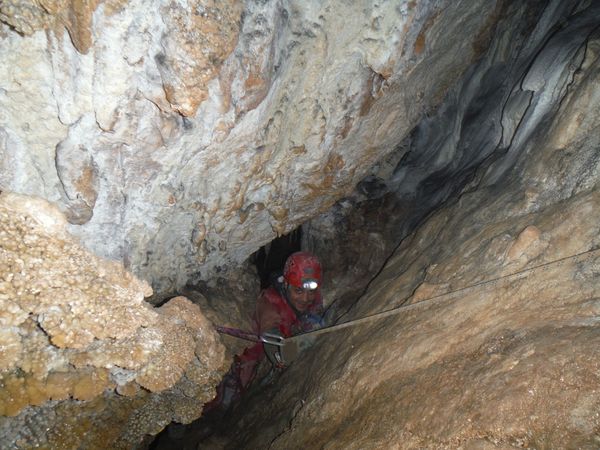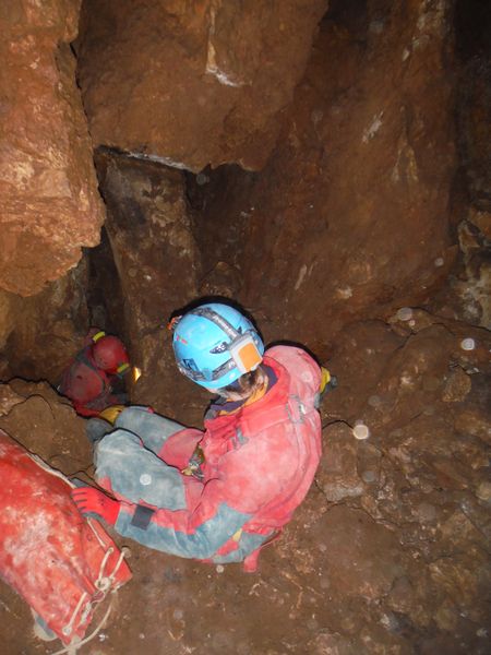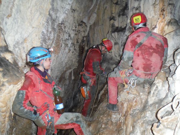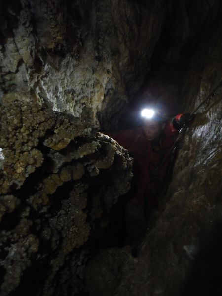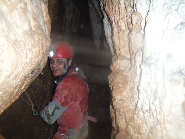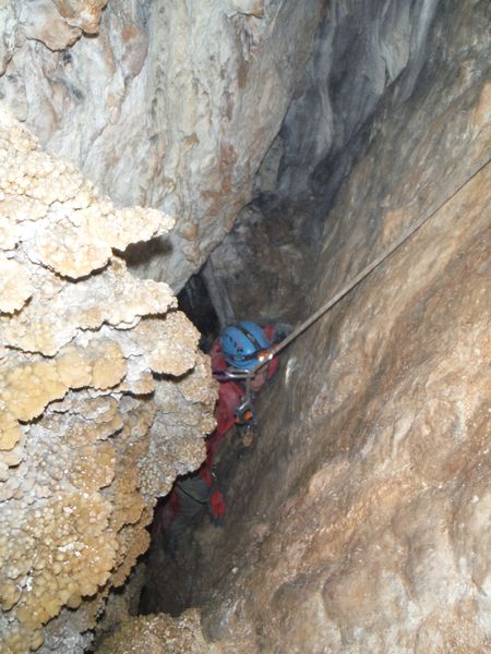 Dopo le foto, il riposo, una buona sorsata di sbobba, possiamo rivestire l’imbrago, rifare i sacchi e prendere la strada del ritorno. Marco e’ gia’ pronto, prende uno zaino e parte. Finisco di prepararmi e parto anche io con il fido zaino al seguito. Marco ci aspetta nella saletta dove parte il pozzo. Recupero la fotocamera giusto in tempo per immortalare l’arrivo della inossidabile Matilde.