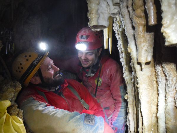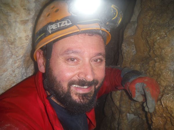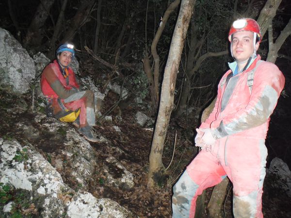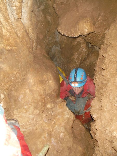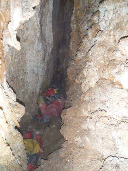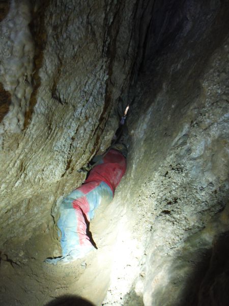 La roccia costringe il corpo a fare una “S” innaturale, ci sono ancora delle asperita’ da togliere ma siamo a buon punto, sono sceso almeno di altri 30 centimetri rispetto alla volta scorsa. Ancora altri turni di lavoro dalla nostra parte. Matilde continua infaticabile ed imperterrita. Fremo mentre gli altri lavorano, non vedo l’ora di riprovare. Appena Simone si allontana dalla strettoia mi insinuo e tento nuovamente. Manco a dirlo ne esco stanchissimo e ancora sconfitto. Mentre sono dentro indico a Matilde quali sono le zone dove lavorare. Lei, oramai ad un passo dall’eroismo, continua a scavare senza sosta. Dal nostro lato possiamo solo lisciare meglio le pareti ma non abbiamo abbastanza spazio per lavorare, la posizione e’ scomodissima ed in pochi minuti si deve abbandonare per i forti dolori al collo e/o alle spalle. Facciamo ancora un paio di turni a lavorare. Matilde ci avverte che gli sembra di aver tolto gli ultimi impedimenti. Sento che questa e’ la volta buona. Mi sento gia’ stanco ma devo provare. Mi stendo nella strettoia a piedi in avanti. Scivolo giu’ fino a dove inizia la zona stretta. Mi ci incastro dentro e riposo qualche secondo. Nel frattempo Matilde dismette i panni del rude muratore e prende quelli da speleo-ostetrica, mi da’ premurose ed attente indicazioni su come gestire questo passaggio che si configura come un vero e proprio parto. Aiutandomi con il gomito destro appoggiato a terra sollevo un poco il busto ed il bacino. Sono arrivato alla zona limite dell’ultima prova. Mi fermo ancora un minuto a prendere fiato, ansimo come un mantice, devo recuperare una respirazione regolare prima di proseguire, temo infatti che dovro’ comprimere il petto per passare. Sono pronto per provare. Matilde mi guida, ho le gambe quasi fuori dalla strettoia, mi indica un buon appiglio in alto, per la mano sinistra. Mi dimeno un po’, mi sento costretto ma non in maniera intollerabile. Il bacino passa, ora anche la gravita’ e’ dalla mia parte. Matilde mi avverte con apprensione che sono praticamente nel vuoto. La tranquillizzo dicendole che ho trovato un appoggio stabile per il piede destro, quello piu’ in basso. Il piede sinistro e’ puntato in alto su una roccia. Devo muovermi, la spalla destra che ora e’ distesa per terra, inizia a farmi male. Mi divincolo, mi rendo conto con soddisfazione di essere avanzato ancora. Ancora qualche movimento e la strettoia finalmente molla la presa. Sono passato! Mi alzo, cerco posto per stare in piedi, mi guardo intorno ancora incredulo. Incontro il sorriso smagliante di Matilde e mi concedo un urlo di gioia! Dall’altra parte Simone e Marco esultano anche loro. Dopo qualche attimo di euforia estrema riprendiamo le redini del nostro umore e decidiamo il da farsi. Matilde mi mostra le sue ferite di guerra, si e’ procurata una vescica di tutto rispetto sulla mano ed ha anche l’aria un po’ stanca. In effetti ha lavorato per 3, tutta da sola! Simone decide di tentare anche lui il passaggio al motto di: “se ci passa Bibbo, ci passo anche io”. Per agevolarlo smazzetto un poco le pareti per spianare qualche piccola asperita’ che ho avuto il piacere di sentir scorrere sulla pelle mentre passavo. Quando Simone impegna la strettoia, Matilde riprende il suo ruolo di speleo-ostetrica aiutando anche lui nella nascita alla nuova grotta. Per fare spazio a Simone e per soddisfare la mia curiosita’ a lungo repressa, scendo qualche metro nella frattura inclinata (tra i 50° ed i 60°, direi) . In quel punto ha una sezione a forma di “occhio” ed e’ alta al centro circa 1 metro, larga almeno 4. La parete su cui poggiano i piedi e’ di sassi e terra, andra’ ripulita con attenzione. La parete di fronte sembra roccia compatta con qualche rado broccoletto. Pochi metri di discesa e si arriva ad un ambiente ampio ed il pavimento formato da rocce crollate. Al centro dell’ambiente dove si arriva c’e’ un foro grossolanamente tondo con un sassone in fondo, saranno un paio di metri. Con un po’ di attenzione si puo’ scendere. Arrivo sul sassone, mi sposto di lato, ora i sassi di crollo su cui poggiavo i piedi poco prima sono il soffitto che ho sopra la testa. Impiego un paio di minuti a controllare che siano stabili. Concludo che lo sono e vado ad esaminare cio’ che ho intorno. Sotto di me c’e’ il nero, si potrebbe ancora scendere qualche metro ma decido che lo faremo un’altra volta, tutti assieme. Lancio qualche sasso nel nero. Sembra esserci un piano inclinato che va da destra verso sinistra per il lato lungo della frattura, un paio di sassi rotolano rumorosamente per alcuni secondi. Annoto mentalmente la possibile partenza del meandro laterale di cui ci aveva detto Matteo la volta scorsa ma sinceramente sono molto piu’ attratto dal nero sottostante. Passo ancora un paio di minuti in contemplazione. Nel frattempo Simone e’ passato anche lui. Sento che chiacchiera con Matilde. Li aggiorno brevemente e anche loro concordano sul fatto di rimandare la discesa alla prossima, quando ci saremo tutti. Mi appresto a risalire, li avverto che non mi tirino sassi addosso mentre mi arrampico sino a loro. Quando siamo riuniti facciamo ancora un giro, meritatissimo, di complimenti a Matilde poi iniziamo il parto in direzione opposta. Simone si offre per primo. Appena lascia un po’ di spazio Matilde ed io facciamo un po’ di pulizia ripulendo la strettoia di sassi e detriti accumulatisi durante il lavoro. E’ il momento di Matilde, probabilmente per lei non e’ piu’ una strettoia. Mentre va mi preparo il passaggio martellando altri piccoli punti ostici. E’ piu’ una rivalsa morale che materiale pero’ serve anche quella mentre mi preparo mentalmente. La stanchezza mi gioca un brutto scherzo, la mazzetta mi schizza via di mano e cade scomparendo nella frattura. Forse si e’ fermata poco sotto ma non me la sento di tentare il recupero. Avverto Simone della grave perdita e, oramai disarmato, mi appresto a 