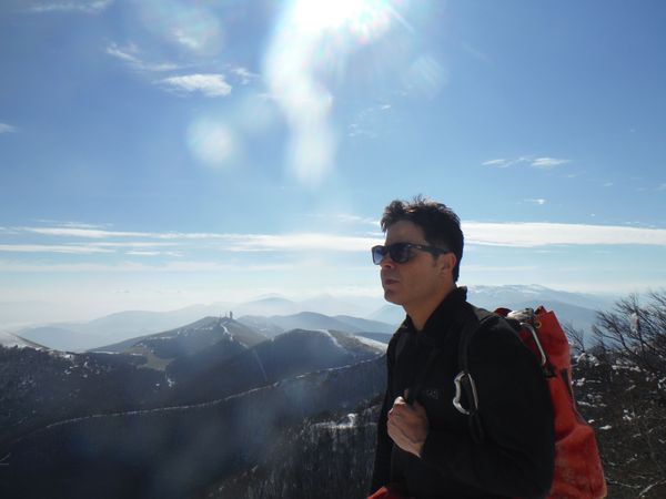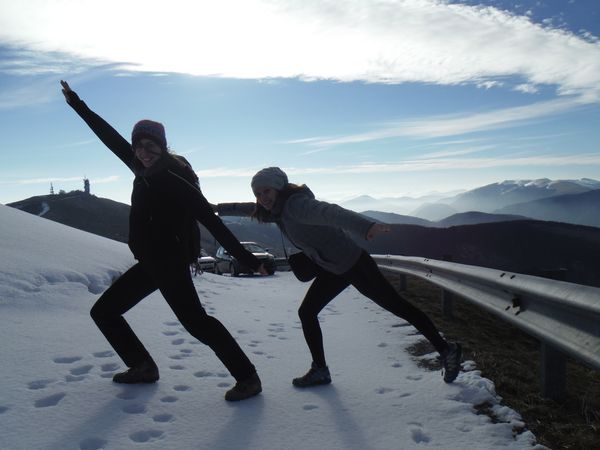 Al bar troviamo ad attenderci solo Marco. Mauro e Tommaso li recupereremo strada facendo. Lasciamo la mia macchina al parcheggio del bar e proseguiamo con la macchina di Marco. Simone e Filippo continuano con la propria. Ecco le nostre sorridenti eroine mentre ci avviamo per il monte Cucco.