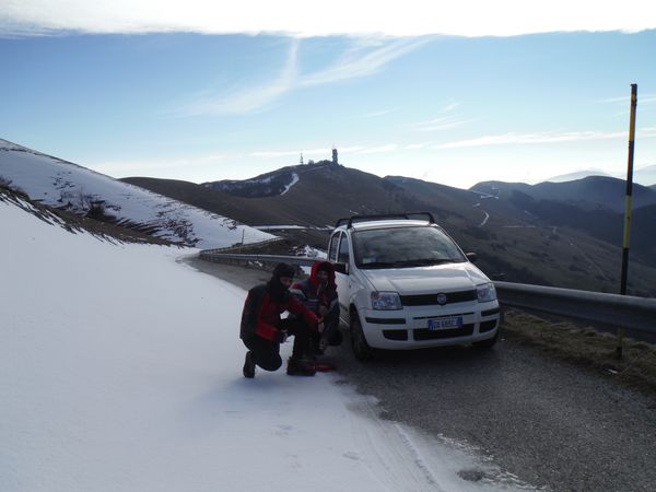 Mentre i nostri sono impegnati con le catene, Matilde ed io andiamo avanti a vedere come e’ la strada fino al parcheggio. Non facciamo a tempo ad arrivarci perche’ ci richiamano indietro. Sembra che il passaggio non sia possibile, neanche con le catene. Torniamo sui nostri passi rassegnati a fare una scarpinata con gli zaini. Siamo distanti ancora un centinaio di metri dalle macchine quando i nostri caparbi amici riescono ad avere la meglio sulla neve e passano l’ostacolo. Ci recuperano e procediamo.