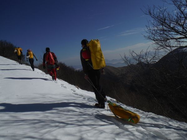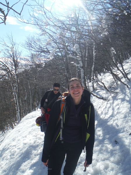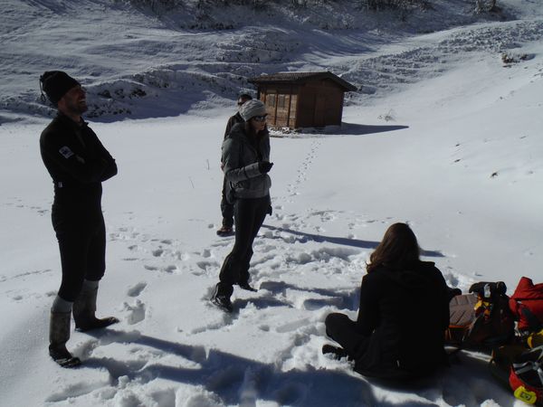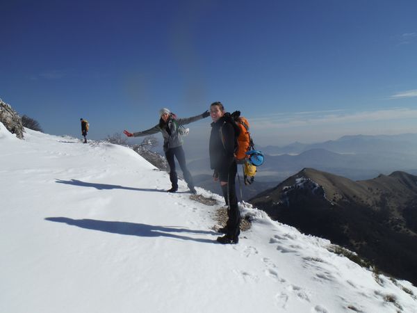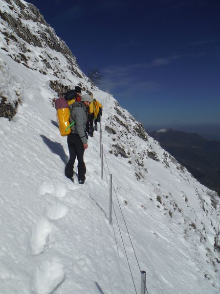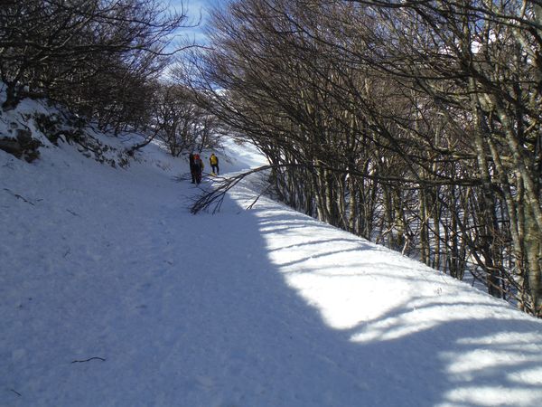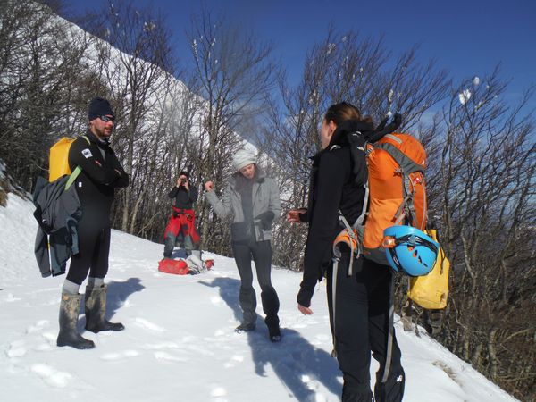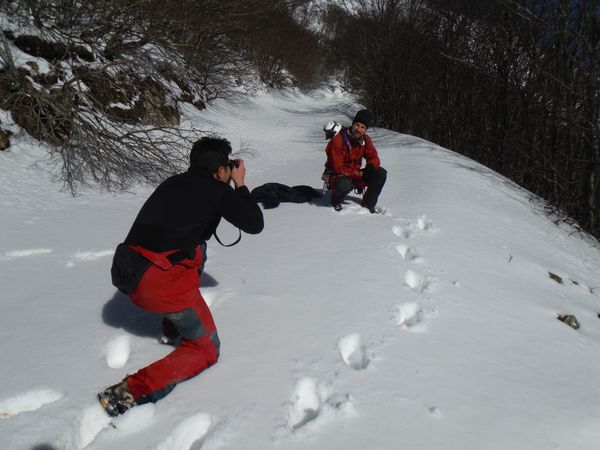 Riprendiamo la camminata. Siamo tutti un po’ euforici per la bella giornata passata assieme e poi anche la neve fa venir voglia di giocare un po’. Vins e Matilde si rotolano assieme sulla neve. Filippo improvvisa una scivolata lasciando una lunga striscia fangosa sul manto nevoso altrimenti immacolato. Anche io, preso dall’euforia che mi da’ solitamente la neve, e visto che ora non devo piu’ conservare la energie per la grotta, mi diverto a provare un breve tratto di corsa. Vado affondando sempre piu’ finche’ sprofondo fino all’anca e cado rovinosamente seguito dallo sguardo divertito del resto del gruppo. Rialzandomi tutto imbiancato non mi accorgo che la fotocamera si e’ riempita di gocce d’acqua, quindi le foto successive alla mia corsetta sono uscite fuori tutte “bagnaticce”.