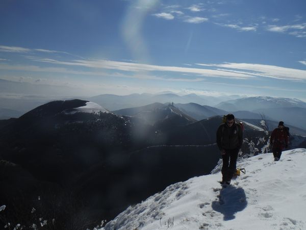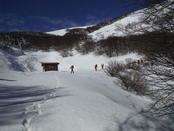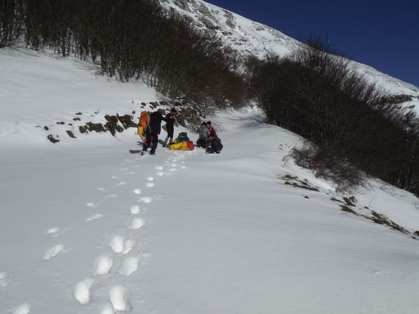 Siamo pronti e bardati con le ghette, possiamo partire. Tommaso ci ha avvertito che e’ quasi arrivato, sta lottando con la neve sulla strada ma conta di raggiungerci a breve. Ci avviamo accompagnati da un bel vento freddo che arriva dalla valle alla nostra destra, ma il bel sole ci fa ben sperare per un avvicinamento tranquillo.