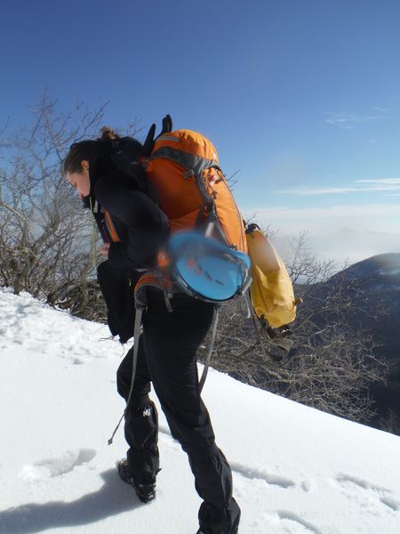Siamo vicini a dove finisce il sentiero “comodo”. Facciamo ancora una breve sosta per riprendere fiato prima dell’ultimo impegnativo tratto. Non sembra, ma camminare con questa neve e’ molto faticoso, ad ogni passo il piede di appoggio va giu’ dai pochi centimetri a ben oltre il ginocchio. Questo rende difficile prendere il proprio passo e rompere il fiato.
