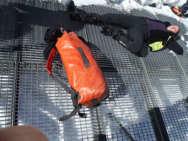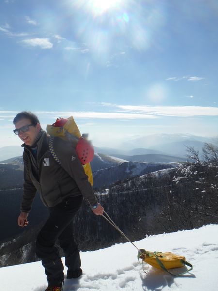 C’e’ chi decide di utilizzare lo zaino come uno slittino.