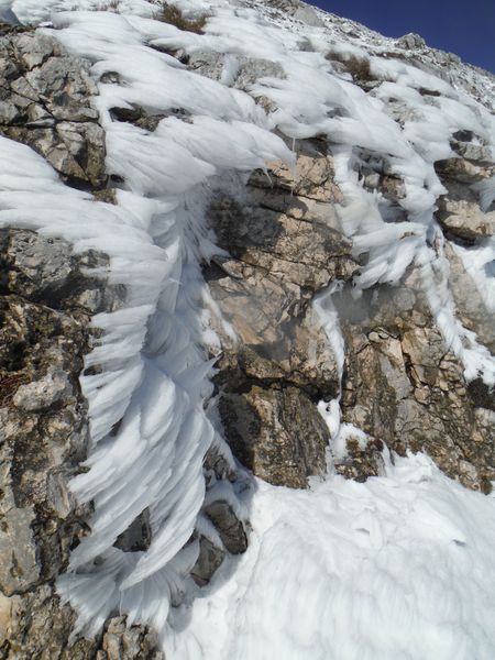 Ci raggiunge un trafelato Tommaso che ha fatto la strada molto di buon passo per raggiungerci.Sono le 11.30, se vogliamo fare un po’ di grotta ed uscire in tempo per la festa dobbiamo andare. Finiamo di bardarci e partiamo. All’inizio delle scale ci sono molte stalattiti di ghiaccio, mentre aspetto il mio turno per scendere immortalo queste a grappolo