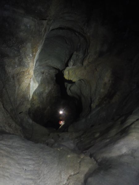 Cammina cammina arriviamo al punto in cui si lascia il percorso turistico e si sale verso il pozzo Terni. Prima si deve affrontare un meandrino allagato ma si passa agevolmente poiche’ e’ armato fisso con il cavo di acciaio. Unica accortezza, darsi la libera tra un tratto e l’altro altrimenti ci si stritola le dita a vicenda tra cavo e roccia! Arrivo facilmente ad affacciarmi al pozzo Terni. Mentre aspetto che venga il mio turno per scendere tento una foto al pozzo, eccone il risultato.