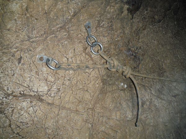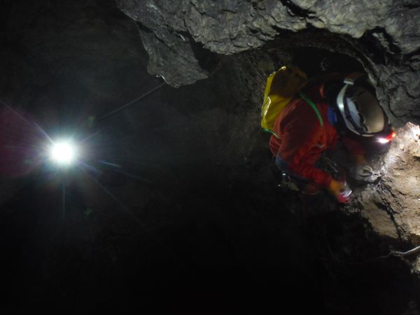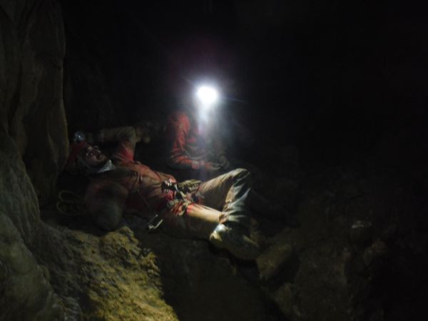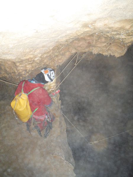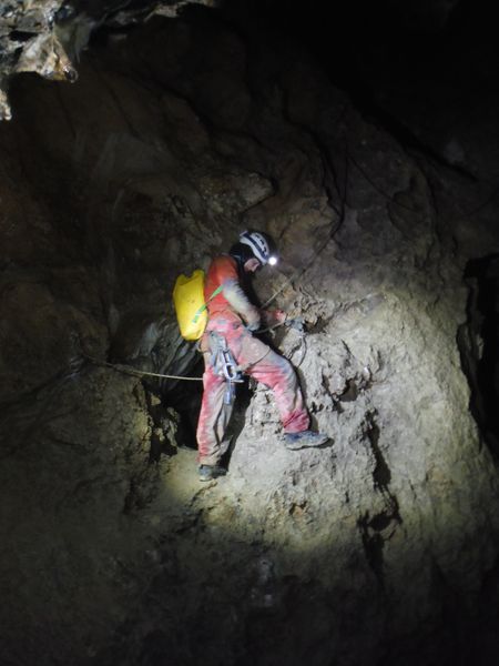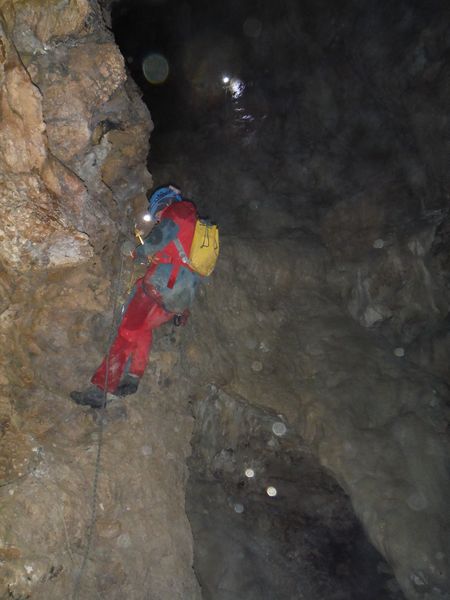 Siamo fermi all’inizio di un traversino esposto che preclude alla risalita di un pozzo di pochi metri. Vins e Mauro attendono pazienti che la corda sia libera.