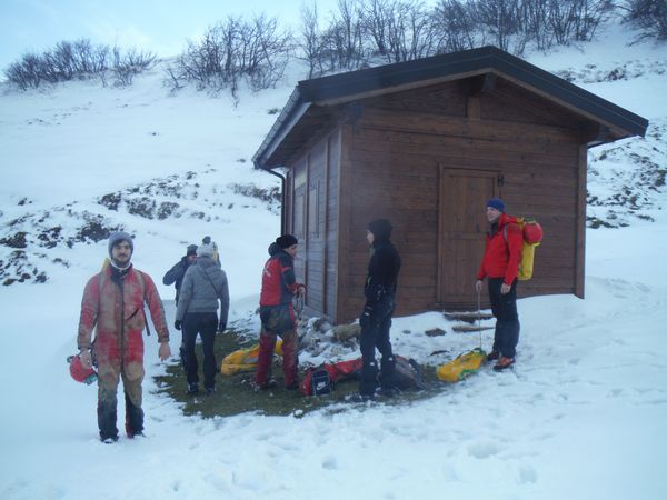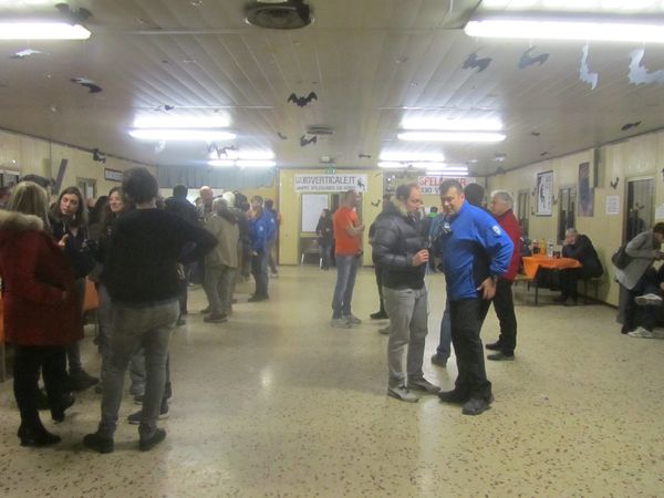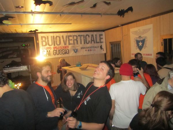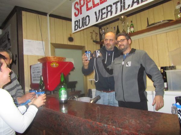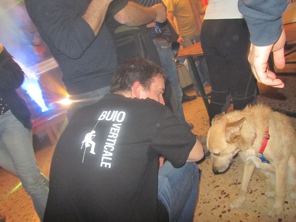 Andiamo a cena in un ristorante/pizzeria vicino alla piazza, siamo tanti e facciamo una bella ed allegra tavolata. Personalmente mi accontento di una pizza, devo tenermi leggero per la gita al Cucco di domani! Durante la cena conosciamo meglio i nostri nuovi amici, si parla della festa di domani sera e di argomenti di vario genere, speleo e non. Dopo cena perfezioniamo l’appuntamento per la mattina seguente. Ci vedremo al distributore Esso alle 8 e poi andremo al bar del vicino paese di Scheggia dove incontreremo Marco e gli altri amici che ci accompagneranno in grotta. Ritornati all’oratorio salutiamo tutti e riprendiamo la strada per il B&B, stavolta ci arrivo anche senza il navigatore. La mattina dopo mi alzo verso le 6 come al solito. Non dico di esserne felice, ma l’abitudine aiuta. Porto Luna a fare la sua passeggiata per i bisognini e per tranquillizzarla, ha gia’ capito che andro’ via ed ha lo sguardo affranto. Quando rientriamo sbrigo le mie faccende con lei che mi segue passo passo con le orecchie basse e l’occhio triste. Tento con un biscotto e qualche minuto di carezze, il suo umore sembra migliorare, si stende vicino al termosifone limitandosi a guatarmi sospettosa mentre preparo lo zaino. Quando sono pronto saluto Betta che dormicchia ed esco alla chetichella. La macchina e’ completamente coperta di brina ghiacciata quindi impiego qualche minuto a pulire i vetri ed a far riscaldare il motore. Arrivo all’oratorio che e’ ancora deserto. Aspettando i miei amici recupero la fotocamera ed immortalo il capannone dove ieri abbiamo trovato i nostri amici cucinieri. In seguito scopriro’ che la festa si terra’ in una costruzione simile, ma subito alla mia sinistra mentre scatto la foto. Simone e gli altri si fanno attendere, inizio ad innervosirmi. Mentre lo chiamo me ne vado al bar del distributore per un cappuccino rilassante. Il buon Simone arriva e deve sopportare il mio nervosismo per il ritardo. Mi dice che la sera prima, alla fine l’appuntamento e’ stato spostato di mezz’ora quindi se la sono presa comoda. Non voglio rovinare la giornata a loro e me per una sciocchezza simile quindi bofonchio le mie rimostranze allo sconcertato Simone e poi archivio la cosa sorseggiandoci sopra il cappuccino.