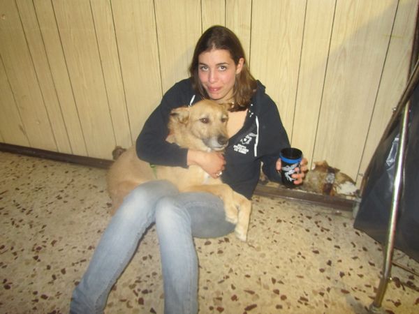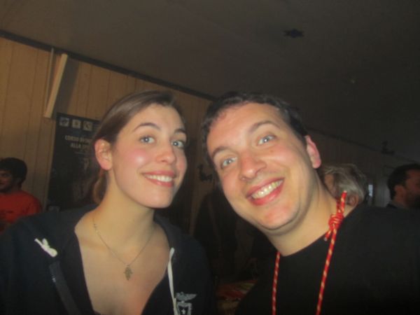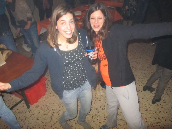 Proprio mentre sono li’ che termino le mie riflessioni sul temibile aggeggio, vengo abbrancato da Matilde che mi trascina al cospetto del manovratore dell’infernale marchingegno. Matilde mi presenta con molto entusiasmo e bei complimenti. Nel frattempo con lo sguardo atterrito io cerco di convincere il tipo a regolare il fessurometro ad una misura comoda. Gli basta squadrarmi per capire e con una occhiata di comprensione regola i chiavistelli del fessurometro alla larghezza massima. Affido il bicchiere a Matilde e mi infilo per saggiare lo stretto. E’ fattibile. Indietreggio un poco per sistemare il braccio destro disteso e poi vado. Soffro appena appena quando devo inarcare la schiena ma passo. Scivolo avanti. La curva successiva e’ dal verso giusto, mi ci infilo e sono fuori. Uno sguardo riconoscente al saggio regolatore e passo ad altro. Nel corso della serata parecchi si cimenteranno con dimensioni di strettoia veramente proibitive. In particolare Vins e Matilde si distingueranno, tanto da meritare entrambe in premio la maglietta del gruppo festeggiato. La festa continua e si accende sempre piu’ a mano a mano che arrivano gli ospiti. Vengono spente le luci ed inizia la musica. Vago per la festa sorbendo la fantastica sangria generosamente elargita al banco bar, simulando balli e scattando foto. Eccone una di Matilde in compagnia di Luna. Luna l’ha praticamente travolta in cerca di conforto, e’ molto disturbata dalla musica ad alto volume e da tutta la confusione.