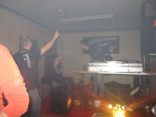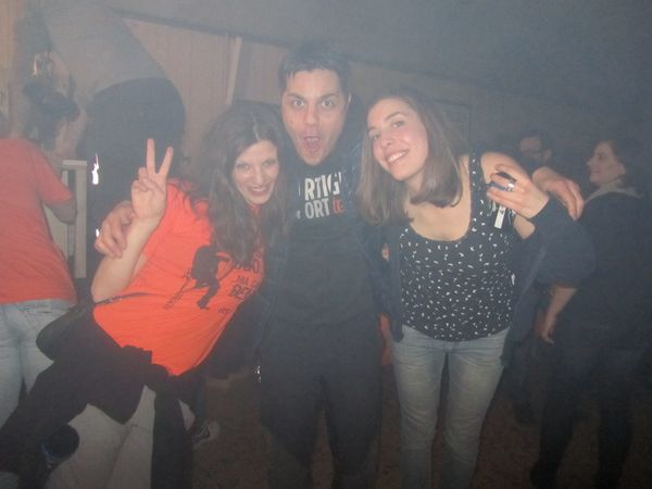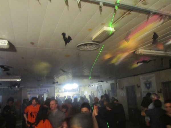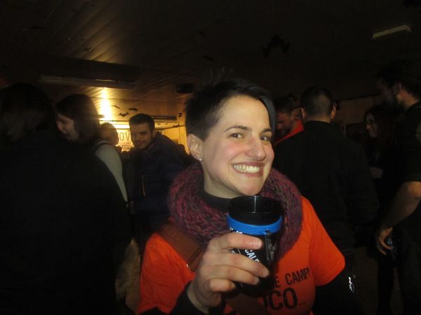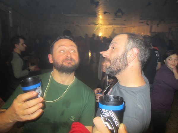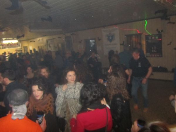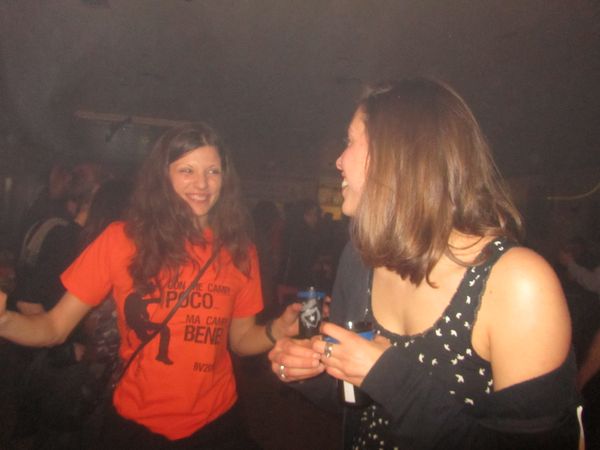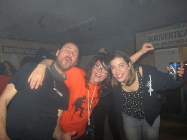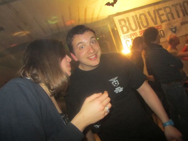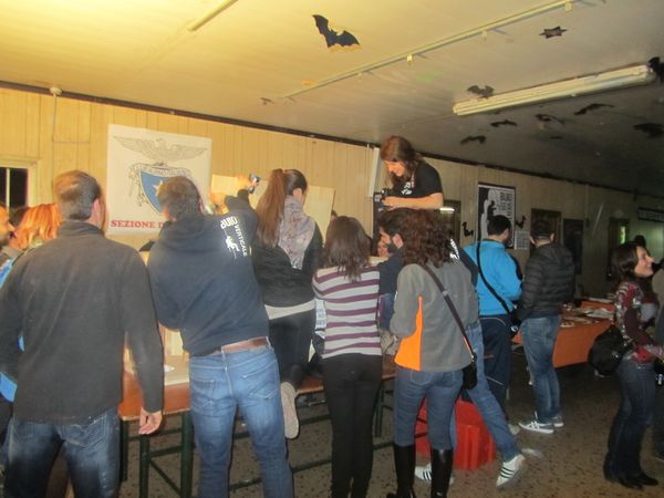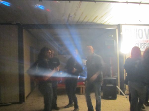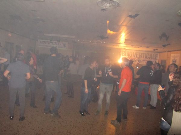 Alle 9 di sera faccio il mio ingresso alla festa. Percorro tutto il salone cercando facce conosciute e salutando chi riconosco. Passo subito a comperare il bicchiere con lo stemma del “Buio Verticale”, il gruppo festeggiato, e poi passo ad una attenta ispezione del tavolo con le cibarie.