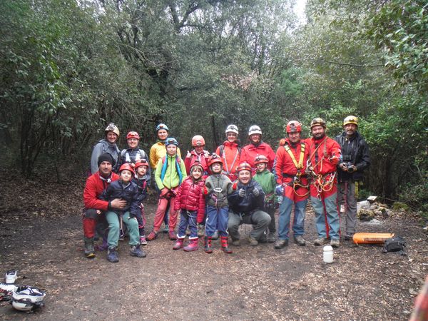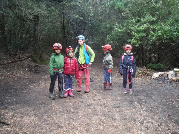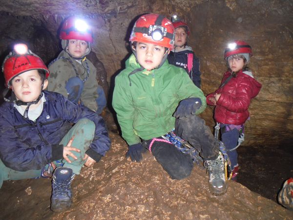 Filippo sta terminando di sistemare una corda guida per un passaggio leggermente esposto, beninteso, un adulto anche volendo non potrebbe cascarci, ma un bimbo puo’ fare un volo di qualche metro in una fessura praticabile solo per loro, quindi ben venga la corda. Aspettando ne approfitto per catturare una foto di gruppo dei nostri impavidi cuccioli di esploratore. Il piu’ a sinistra altri non e’ che Giona, il figlio di Filippo che gia’ si muove come uno speleo fatto e finito!