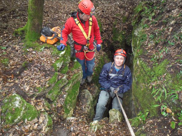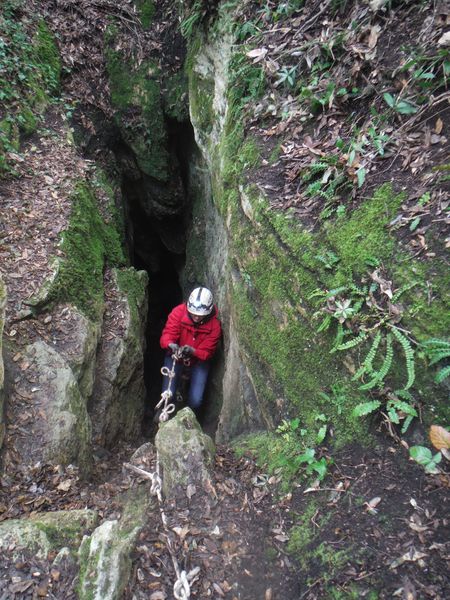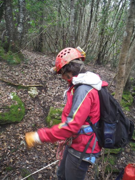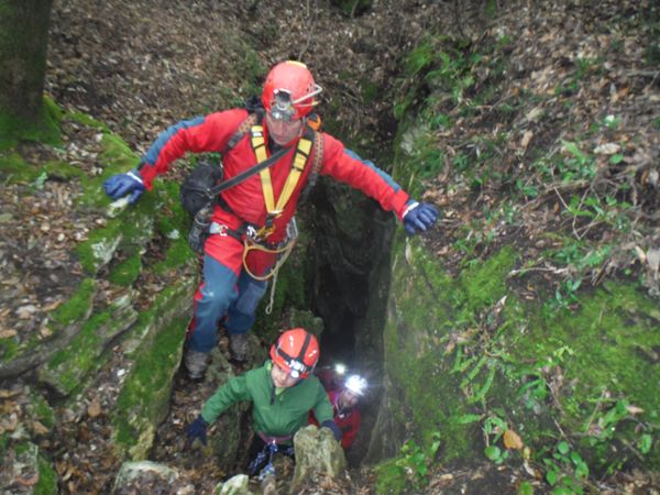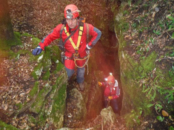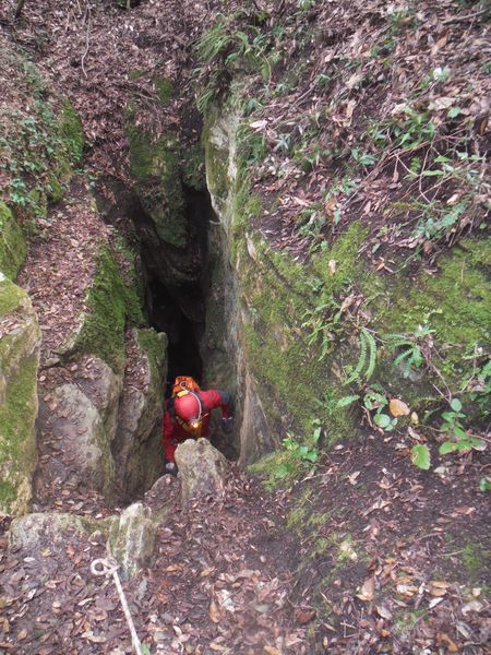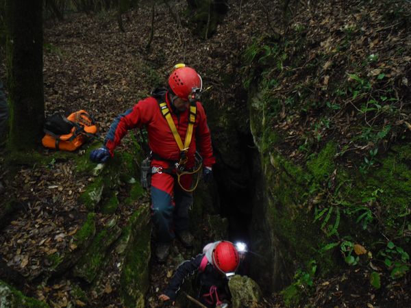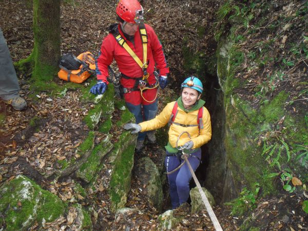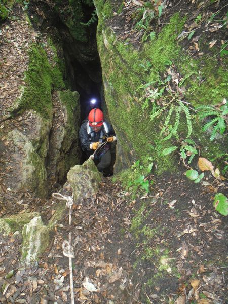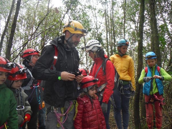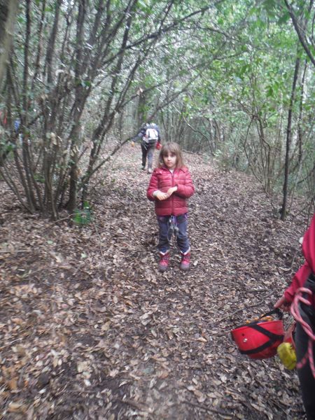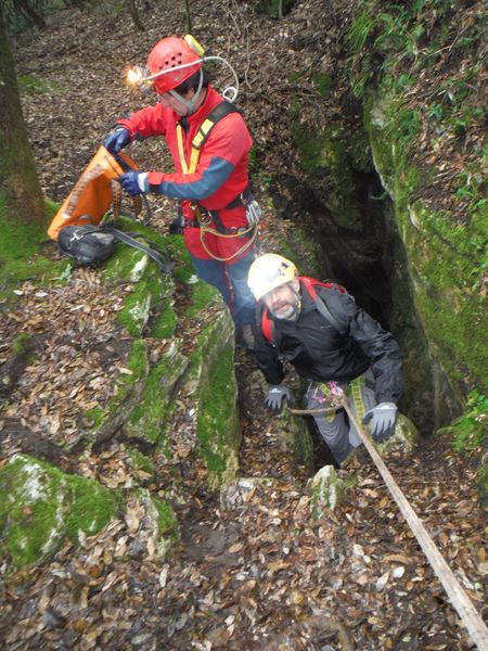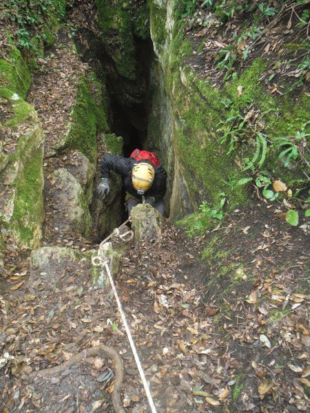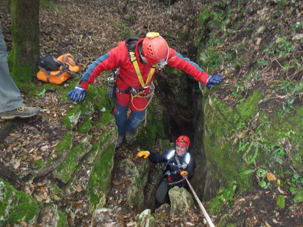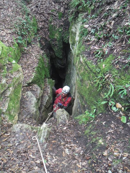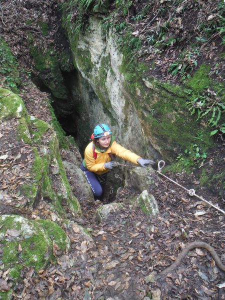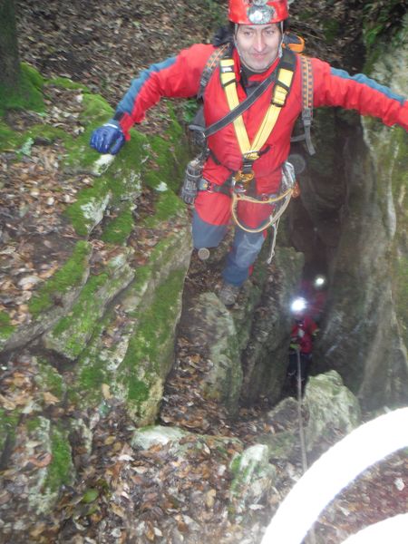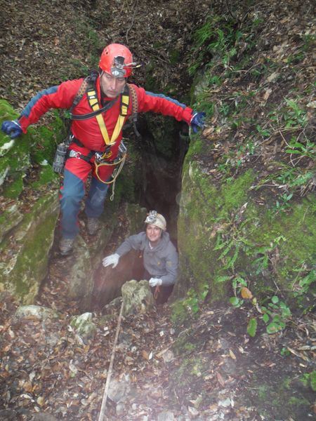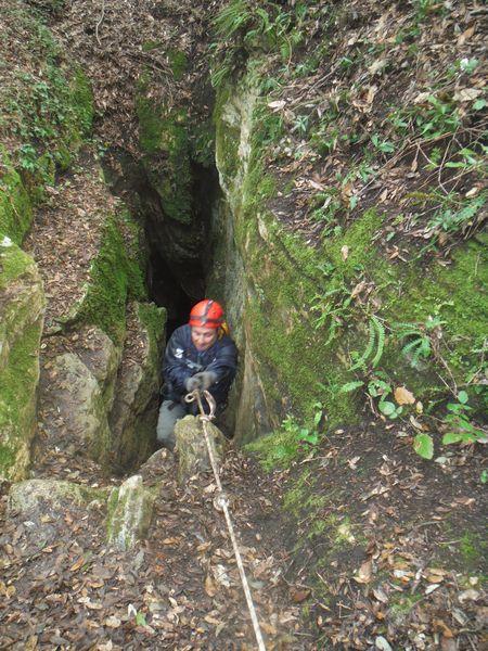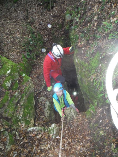 Nel frattempo ho sistemato la corda al vicino albero per attrezzare una calata che aiuti i nostri eroi a scendere senza scivolare rovinosamente sul viscidissimo fango che pavimenta la spaccatura. Filippo si posiziona a meta’ spaccatura per aiutare i passanti a superare il primo gradino. La scelta del primo ardito cade sul ragazzo piu’ grandicello (ho chiesto il suo nome almeno 10 volte e ancora non lo ricordo, che vergogna!) che sembra essere il meno impensierito dal cimento. Comunque un bravo a lui!