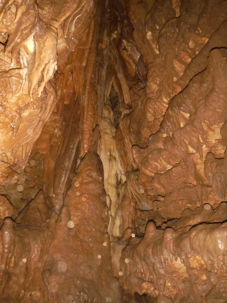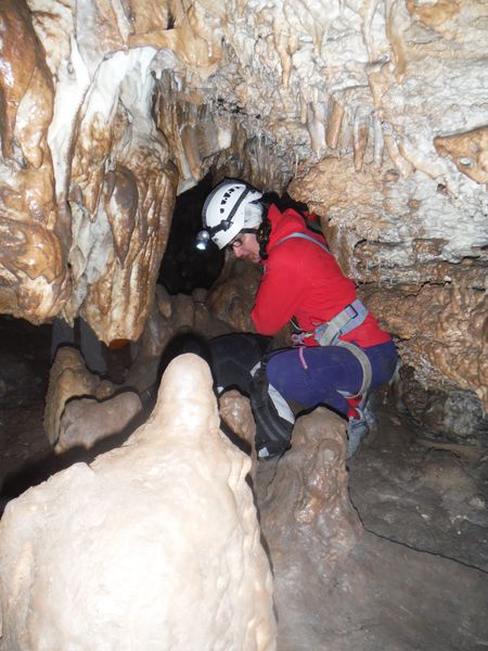 Nella frattura sopra di noi noto segni di passaggio. Mi arrampico per andare a dare una occhiata. Trovo nulla di notevole se non alcune concrezioni spaccate. Mi fermo sopra e scatto un paio di foto.