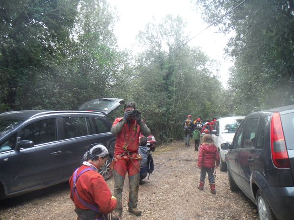 Ma ora veniamo a noi. La mattina di domenica esco di buon ora con Luna a fare la passeggiata poi torniamo a “casa”. Svicolo poi di soppiatto per evitare che Luna si metta a piangere e raggiungo la piazza li vicino, dove Simone verra’ a prelevarmi alle 7.15. Una rapida tappa per la colazione e poi ci rechiamo all’appuntamento comune con i ragazzi del CAI. All’appuntamento ritrovo Filippo e Giuseppe, che rivedo sempre volentieri. Una volta radunati tutti e composte le macchine, partiamo. Cerchiamo di sbrigarci un po’ perche’ oggi la grotta sara’ affollata. Oltre alla dozzina di persone del nostro gruppo ci sara’ una cinquantina di persone del CAI di Perugia. Quando arriviamo al parcheggio vicino alla grotta ancora c’e’ nessuno. Parcheggiamo senza occupare lo spiazzo per lasciarlo libero per i ragazzi di Perugia. Iniziamo la vestizione.