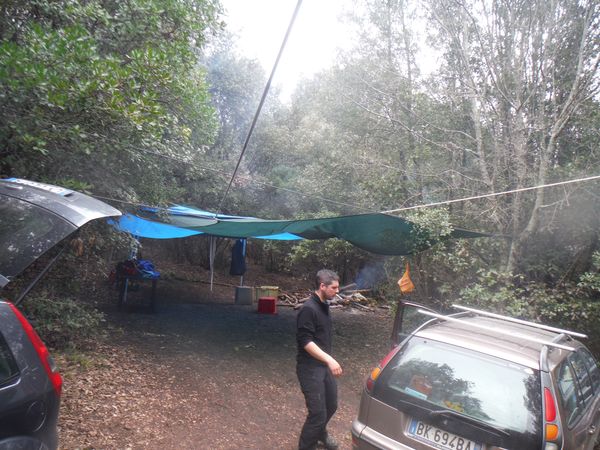 Torniamo allo spiazzo del parcheggio e troviamo una sorpresa. E’ stato trasformato in un capace riparo. Il fuoco gia’ arde allegramente, sara’ pronto per l’ora di cena, quando il grosso del gruppo uscira’. Non c’e’ che dire, a Perugia sanno organizzarsi alla grande! Per un poco medito se affiliarmi seduta stante al loro gruppo!
