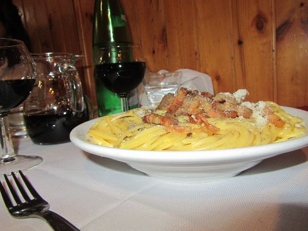 Andiamo alla piazza del comune dove aspettiamo invano Giuseppe. Una volta perse le speranze di vederlo ci avviamo prima al bar per un rapido aperitivo e quindi al ristorante dove fanno una squisita carbonara, che vi presento in tutta la sua magnificenza.