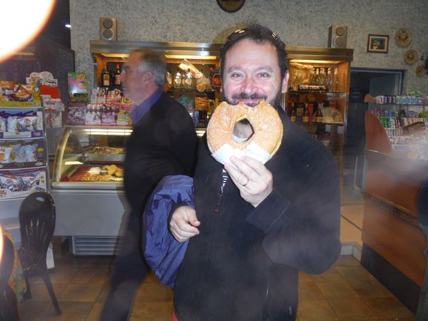 La giornata ha avuto una gestazione lunga ma una volta avviati siamo andati benone! La partenza, complice l’ora legale scattata durante la notte, e’ stata proprio in salita. L’appuntamento e’ per le 8.15 sotto casa nostra. Betta, io e Luna siamo pronti ed in orario ma devo ammettere che viene facile perche’ siamo in una situazione privilegiata! Stiamo uscendo di casa quando mi arriva il messaggio di Claudio, sono arrivati anche loro. Scambiamo i saluti con Vincenzina, Claudio e Valerio e poi ci predisponiamo alla attesa di Matilde. Valerio e Claudio fanno un salto al bar per un caffe’, noi altri ci spostiamo all’incrocio con via Lorenzo il Magnifico dove un tiepido sole arriva a riscaldare l’aria fredda del mattino. Tanto per passare il tempo tempestiamo Matilde di telefonate e messaggi, lei ogni volta ci risponde serafica che e’ praticamente arrivata. Claudio e Valerio tornano dal bar e rimangono in macchina in paziente attesa. Finalmente ci vediamo spuntare davanti Matilde. E’ nella macchina di Michele, che ancora non conosciamo quindi deve sporgersi dal finestrino della macchina perche’ a tutta prima non ci accorgiamo che e’ proprio lei. Matilde fa le presentazioni con il consueto, allegro, entusiasmo. Oggi anche Michele avra’ l’indubbio piacere di provare le trappole con cui solitamente andiamo in grotta. Sistemo lo zainone nella macchina di Claudio. Stavolta noi saremo ospiti di Michele e Matilde. Carichiamo Luna in macchina e prendiamo posto anche noi. Si parte verso l’autostrada. La nostra destinazione e’ il bar “Zanzibar” che si incontra vicino Stimigliano, lungo la strada per andare a Montebuono. E’ un bar che non esiterei a paragonare al “bar fico” vicino ad Ikea di Anagnina, poi capirete perche’! Strada facendo Claudio si ferma all’uscita dell’autostrada di Ponzano Romano per raccattare gli altri ragazzi che oggi si diletteranno insieme a noi. Approfitto, ve li presento, sono Arianna, Sara, Carlo, e Lorenzo. Siamo in dirittura di arrivo per il bar quando ricevo la telefonata di Simone. E’ al bar e ci aspetta per colazionare tutti assieme. Quando scendo dalla macchina provvedo a far uscire Luna che scalpita e poi mi trovo con piacere a salutare Simone ed il buon Fabrizio, conosciuto anche come “il radiologo”. E’ stato in dubbio di poter venire, ma poi evidentemente, ce l’ha fatta ad unirsi a noi. Sentiamo Claudio al telefono, si e’ un po’ perso per la Sabina ma riusciamo a ricondurlo per la retta via. Ora e’ in arrivo, ma non ce la faccio proprio ad aspettare oltre. Entro nel bar gia’ cercando con gli occhi quello che ho golosamente immaginato di gustare fin dalla mattina…il ciambellone. Eccoli! Sono in bella vista proprio di fronte a me. Mi approprio di uno di loro ed inizio a degustarlo con evidente piacere, tanto che Matilde mi ruba la fotocamera ed immortala il momento.