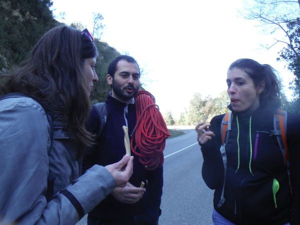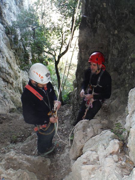 Per non fare brutta figura avevamo anche stilato una sorta di programma per avere un filo conduttore da seguire. Lo recupero sul telefonino, ci sistemiamo comodi per quanto si puo’ ed inizio a sproloquiare su fattore di caduta, carico di rottura ed altre piacevolezze. Mi ascoltano con la pazienza tipica di chi ascolta uno che farnetica ma si rianimano quando passiamo a provare i nodi. Fornisco ad ognuno un cordino per fare le prove e passiamo insieme una oretta spensierata a provare i nodi. A stare fermi pero’ fa un po’ freddo, ho le mani ghiacciate e vedo che anche gli altri non stanno meglio. Nel frattempo Claudio e Simone hanno terminato con l’armo. Dichiariamo sospese le lezioni teoriche. E’ arrivato il momento di giocare un po’ su corda. Ci dividiamo in 2 gruppi, Michele e Lorenzo, che sono alle prime armi vanno ad esercitarsi a salire e scendere su corda sotto la guida attenta di Valerio.