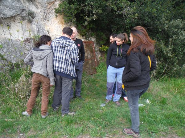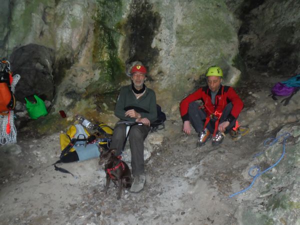 Mentre gli altri sono tutti impegnatissimi, Claudio riceve la telefonata di un amico, Andrea, credo. Ci ha raggiunti sulla strada ma non trova il sentiero giusto per arrivare al grottone. Claudio cerca di risolvere al telefono ma e’ oggettivamente complicato. Decidiamo quindi di scendere a prenderlo. La breve sgambata per la discesa e quindi la salita e’ proprio quel che ci voleva per scaldarmi. Ecco il nostro ospite con la sua dolcissima cagnolina mentre riprende fiato. Si trattiene poco, sua moglie e’ rimasta ad aspettarlo in macchina. Scambiano qualche parola con Claudio e poi riparte. Lo salutiamo tutti ringraziandolo per la visita.