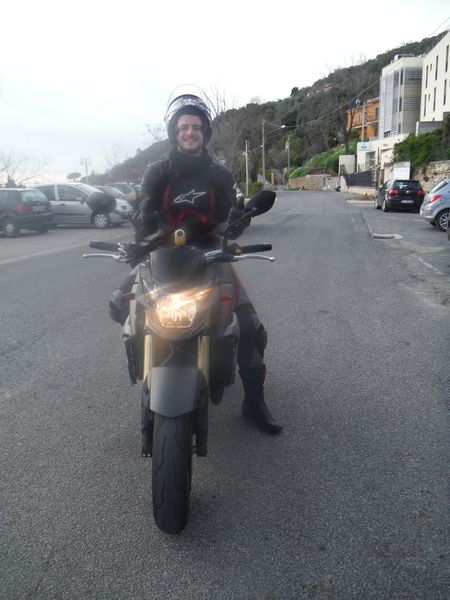 Dopo una adeguata sosta davanti alla grotta del Pretaro risaliamo in macchina per i pochi metri che ci separano dal bar. Arrivati alla piazzetta di stamane, chiamo Betta perche’ ci raggiunga, poi mi avvio per bere qualcosa in compagnia dei miei amici. Mentre attraverso la strada rischio di venir investito da una moto tutta nera. Non me la prendo, ho riconosciuto il buon Andrea, di ritorno da un giretto in moto. Mi affretto a fotografarlo dopo averlo salutato con affetto, non ci vediamo almeno da Natale.