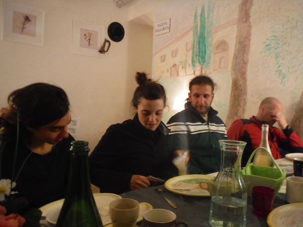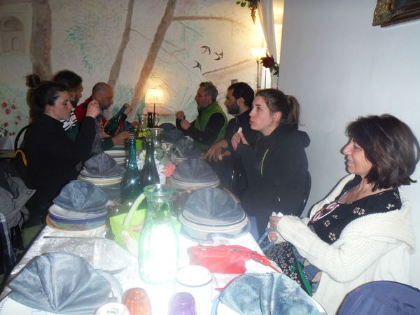 Tra un bicchiere di birra e qualche pacchetto di patatine fritte sbrighiamo brillantemente anche la pratica “aperitivo”. Betta ci raggiunge con Luna al seguito e si unisce volentieri alle nostre chiacchiere rilassate. Uno sguardo all’orologio ci convince che e’ ora di avviarci per S.Oreste, rischiamo di arrivare tardi da “Alessandro al Campanile”, la nostra meta per la cena che fara’ da suggello alla bella giornata. Arriviamo tutti assieme ma poi ci sparpagliamo per il parcheggio. Ci riuniamo quasi tutti alla piazzetta subito dopo l’ingresso in centro paese. Mancano solo Claudio e Valerio. Li aspettiamo con fiducia per alcuni minuti.