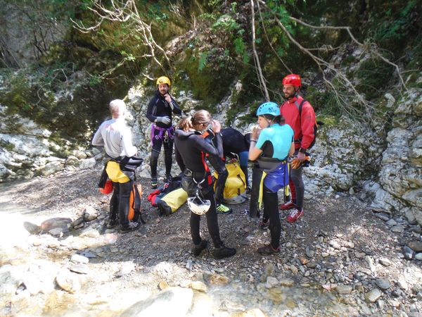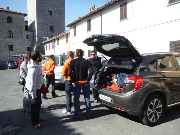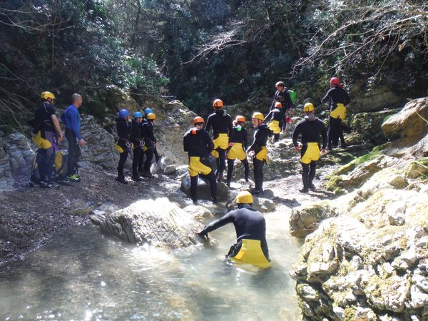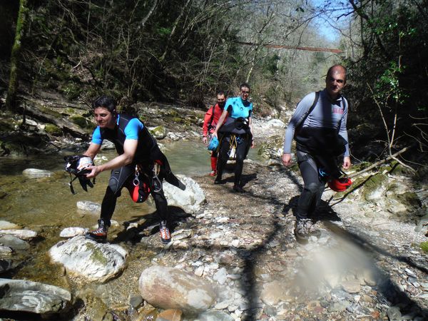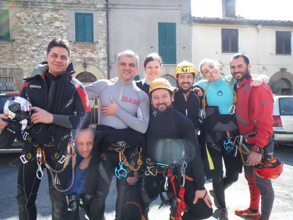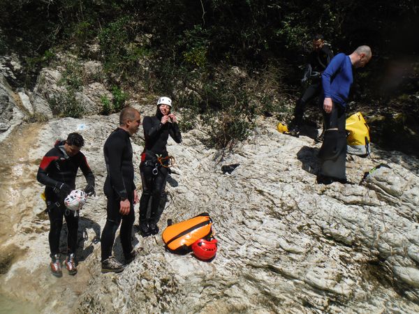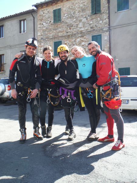 Con la dovuta calma ce la faccio e raggiungo gli altri che fanno capannello vicino la macchina di Simone per gli ultimi ritocchi e verifiche alla attrezzatura. Alla fine della piazza gia’ si vede un nutrito gruppo di persone pronto a partire per la forra.