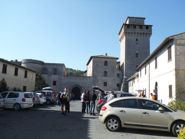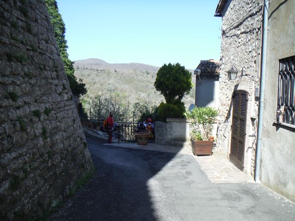 Terminata la foto e’ tempo di andare. Claudio parte come un missiletto verso il fondo della piazza e gli altri lo seguono. Mi attardo qualche secondo a raccattare le mie carabattole e…mi ritrovo solo! Mi affretto verso la direzione dove sono spariti, in fondo alla piazza sulla destra c’e’ una stradina. Giro per di la’ e li vedo che mi aspettano per imboccare la stradina che esce dal paese.